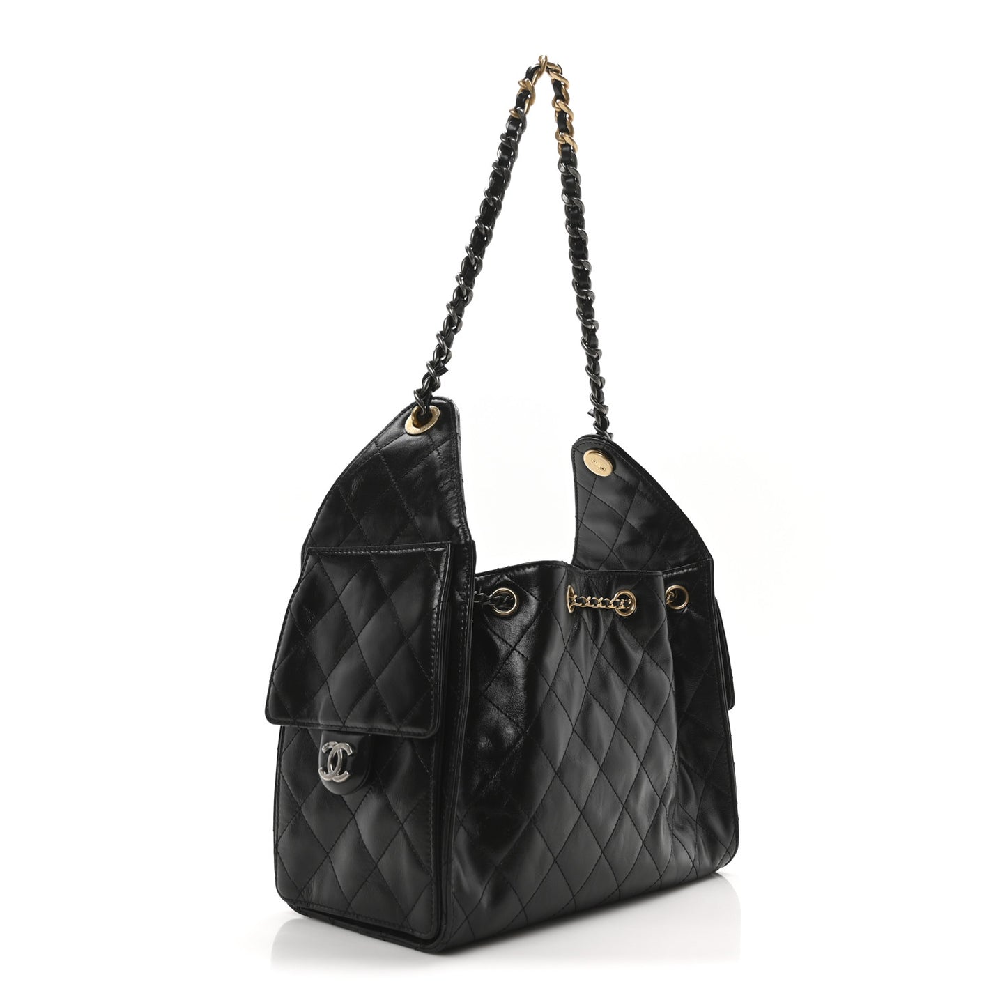 This is an authentic CHANEL Shiny Crumpled Calfskin Quilted Small Chanel 25 Handbag in Black. This chic shoulder bag is crafted of caviar calfskin leather in black. It features a ruthenium and aged gold mixed metal chain leather shoulder strap, a two side pockets, and ruthenium and gold hardware. The top opens to a fabric interior with a patch pocket.Follow this item for alerts. Chanel is a registered trademark of Chanel. FASHIONPHILE is not affiliated with Chanel.