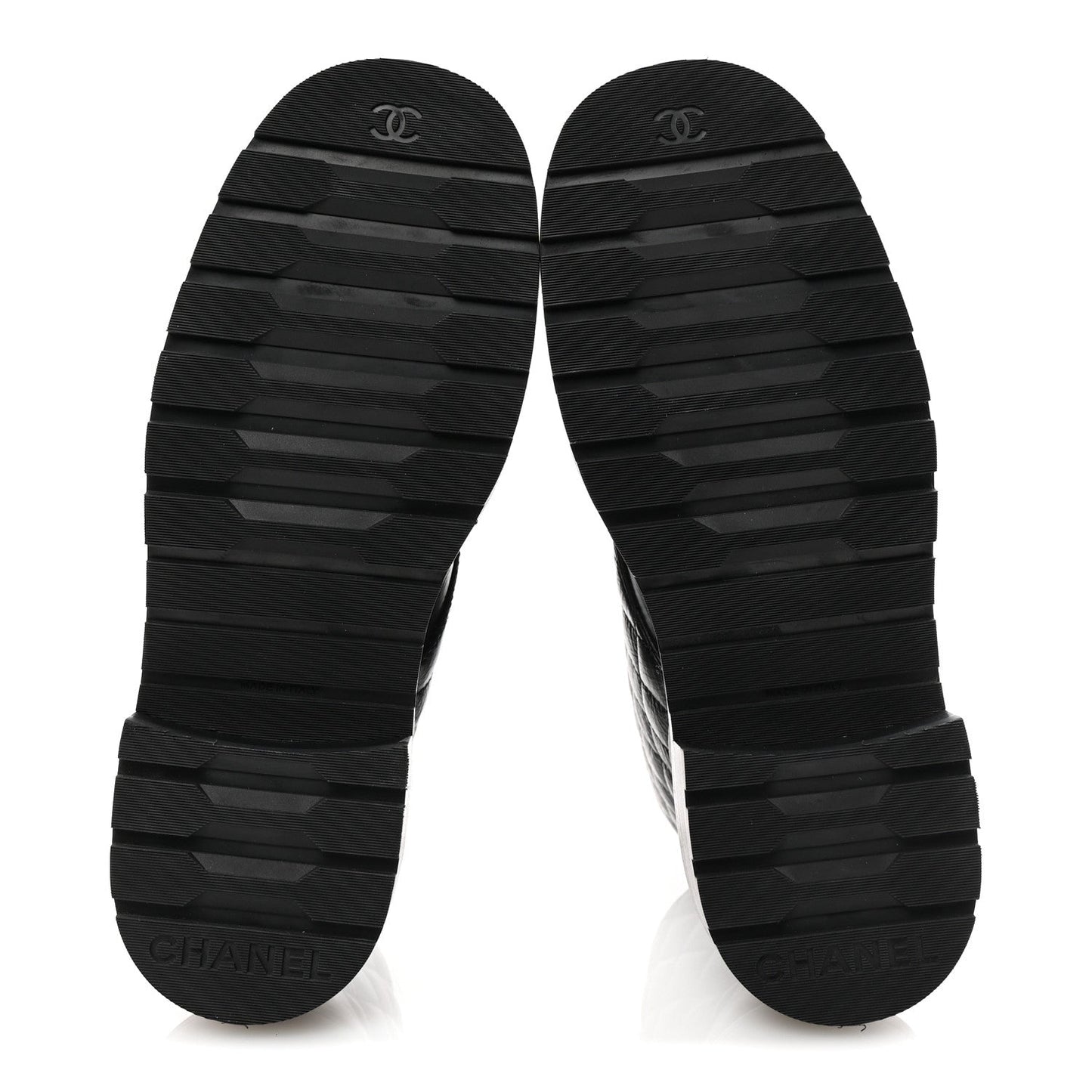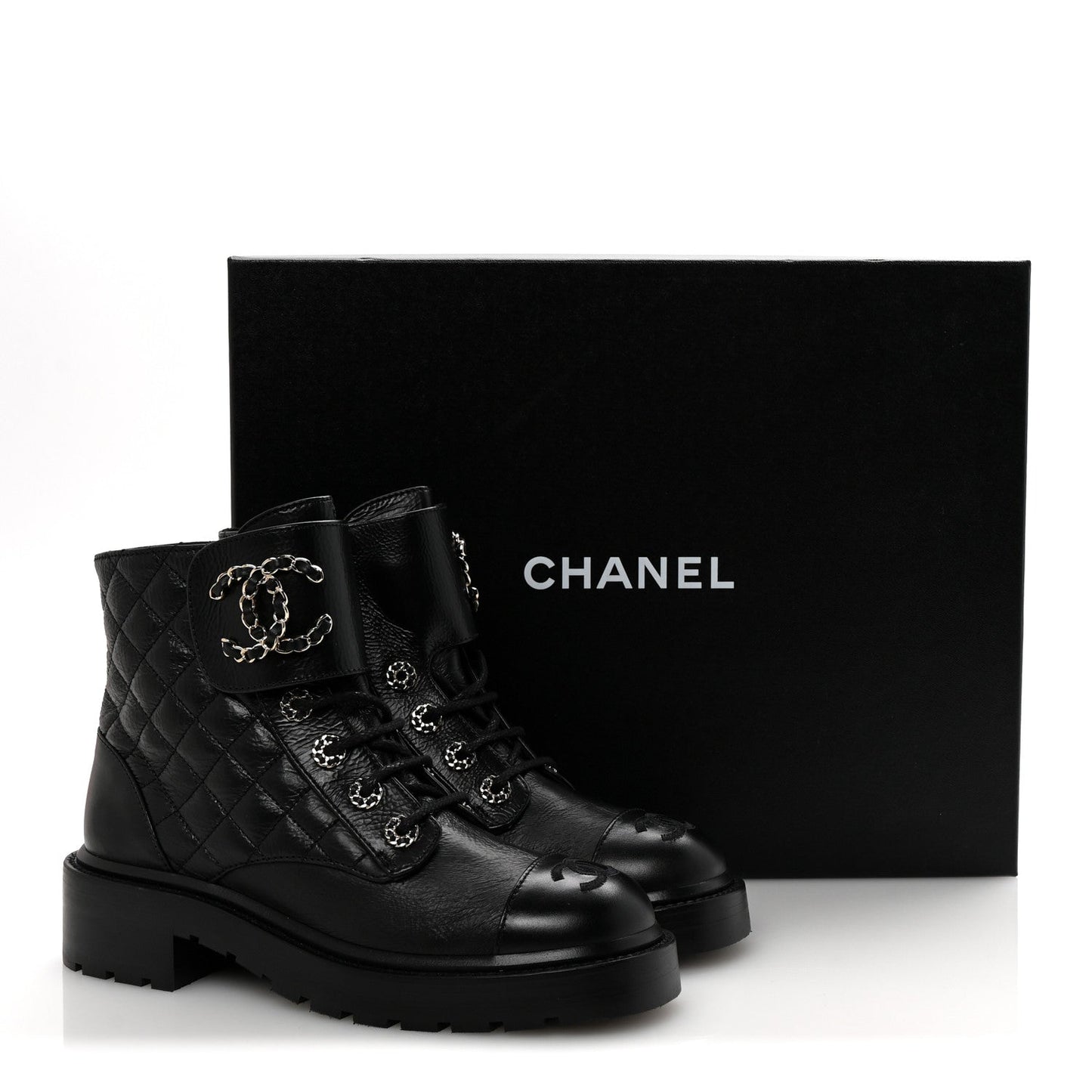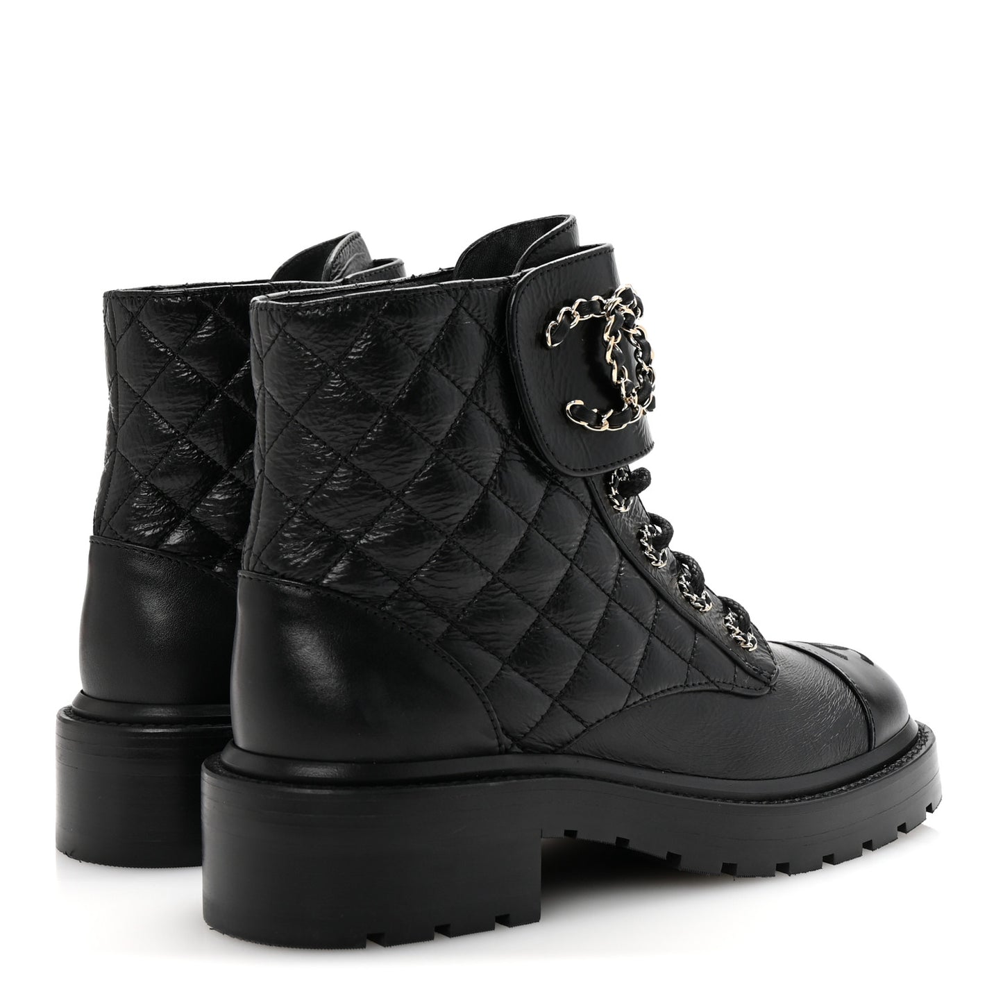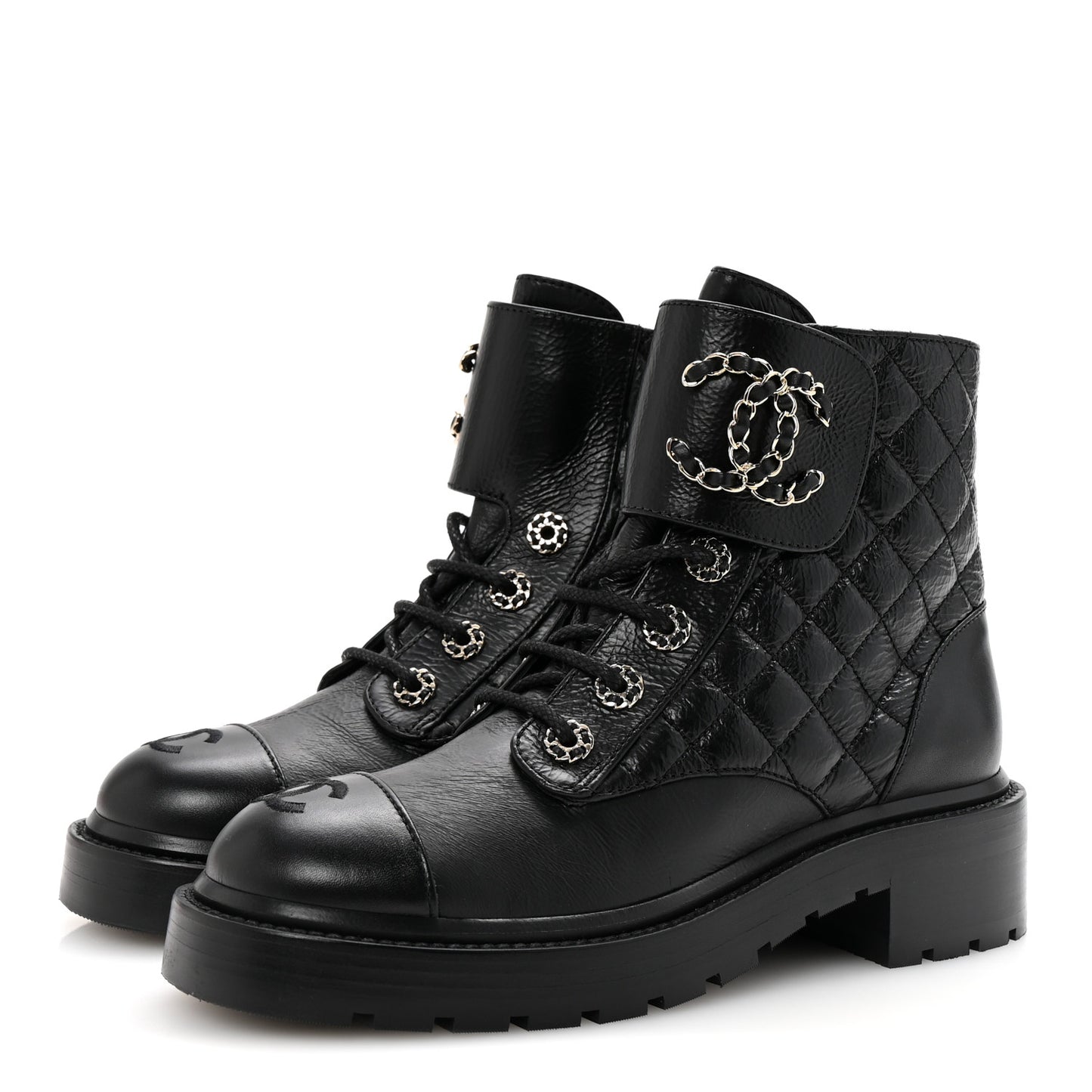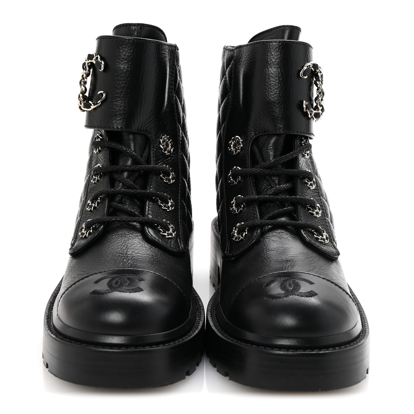 Chanel/ Accessories/ Shoes /Chanel Shiny Goatskin Calfskin Quilted Lace Up Combat Boots 37 Black