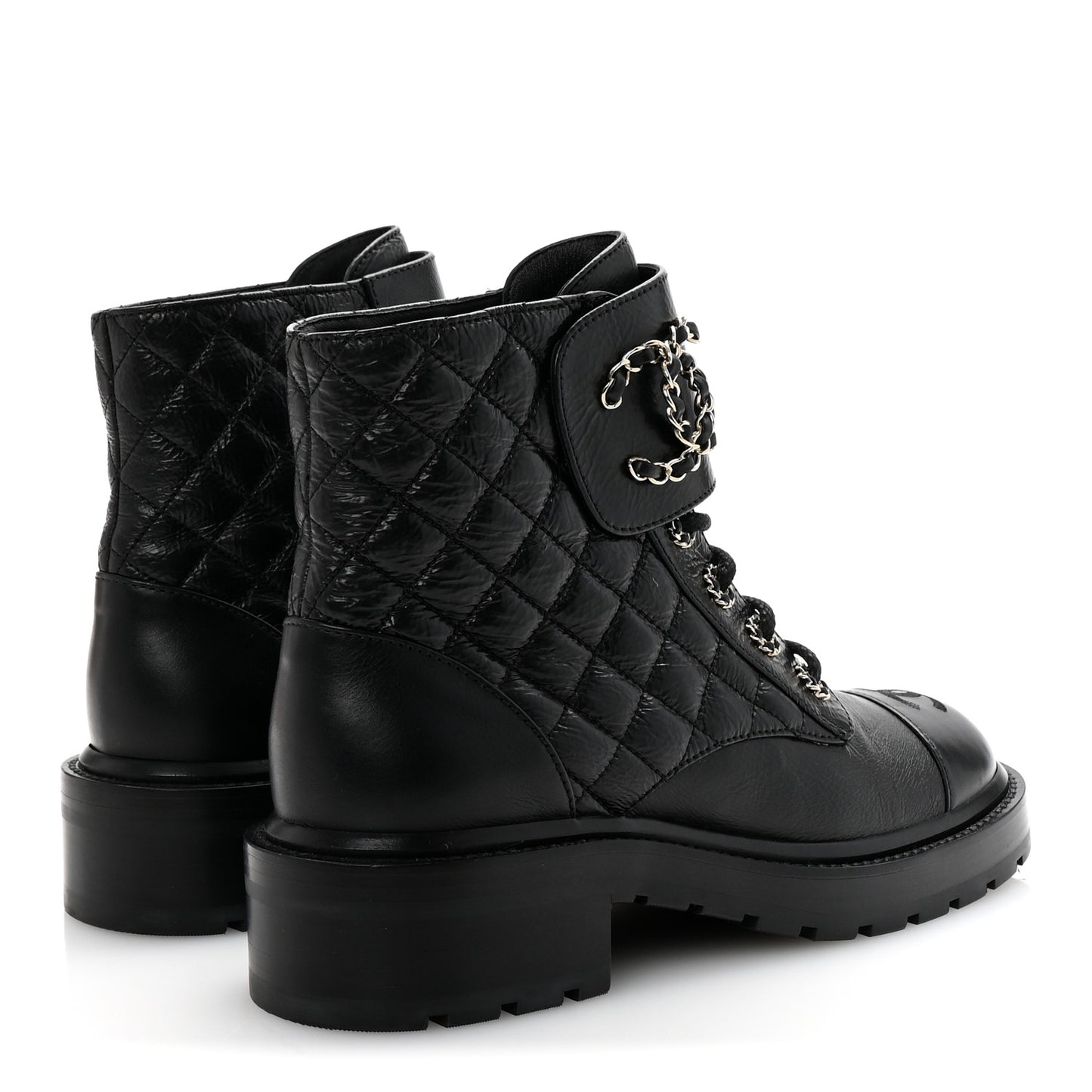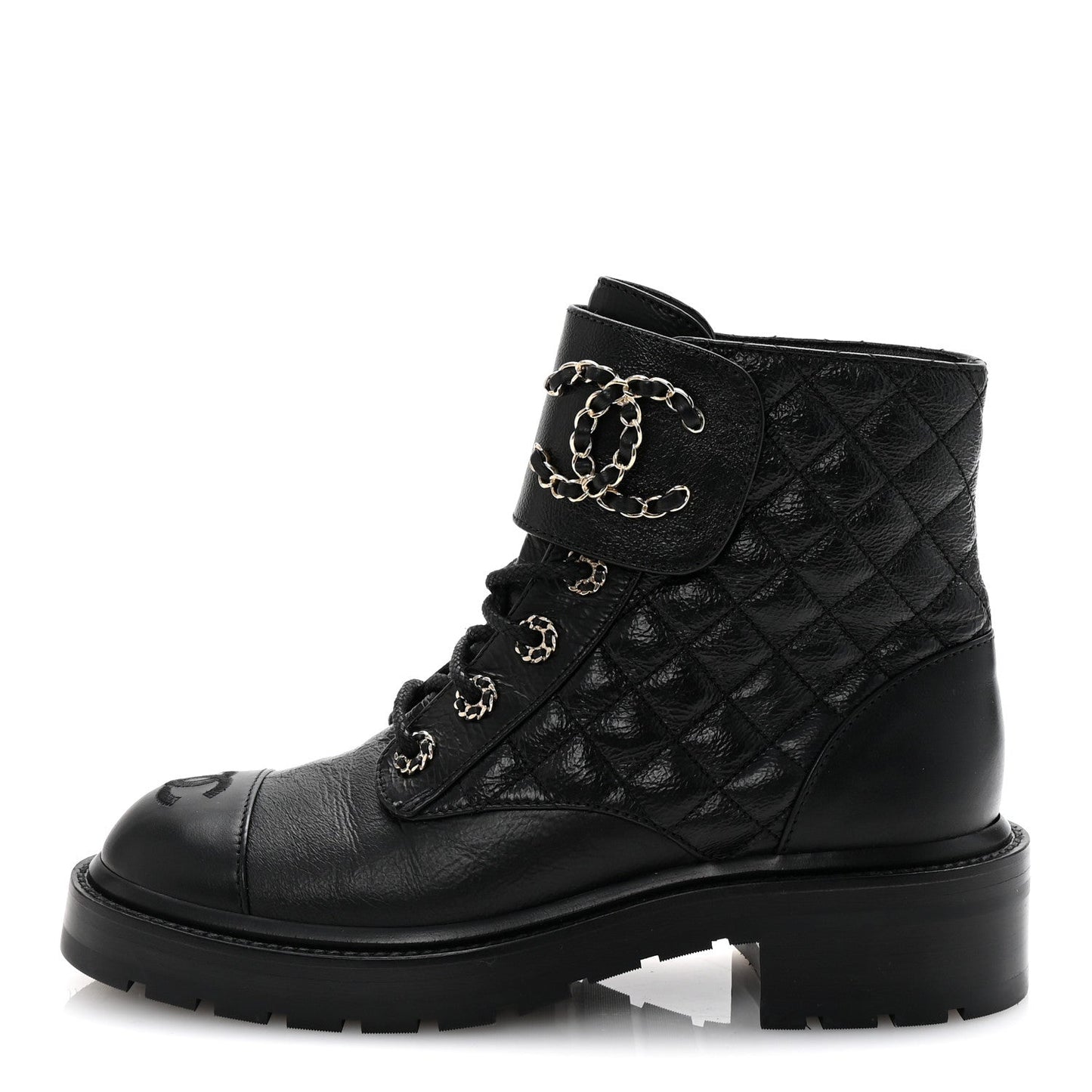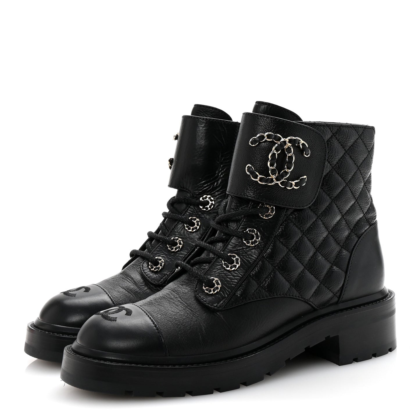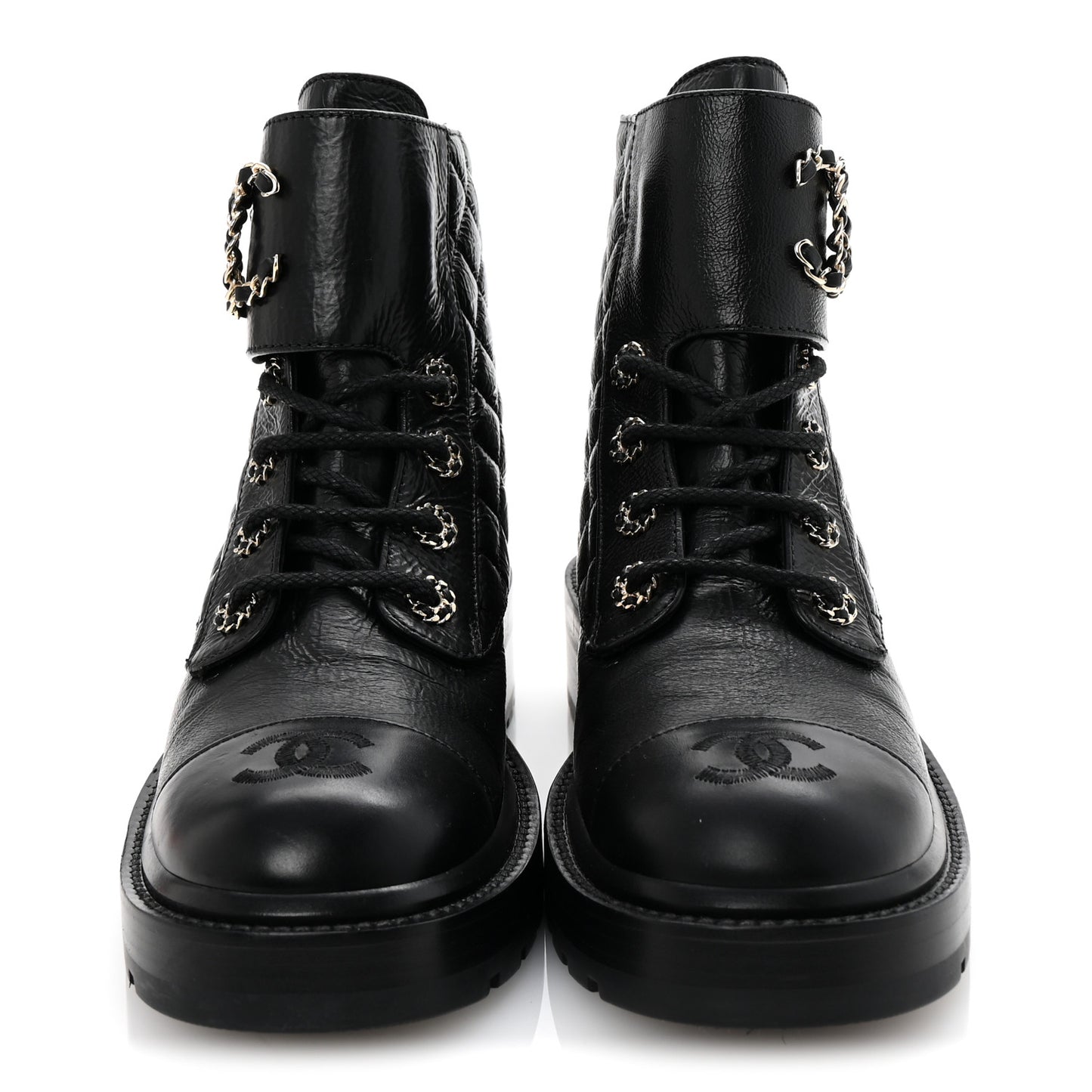 Chanel/ Accessories/ Shoes /Chanel Shiny Lambskin Quilted Lace Up Combat Boots 38 Black