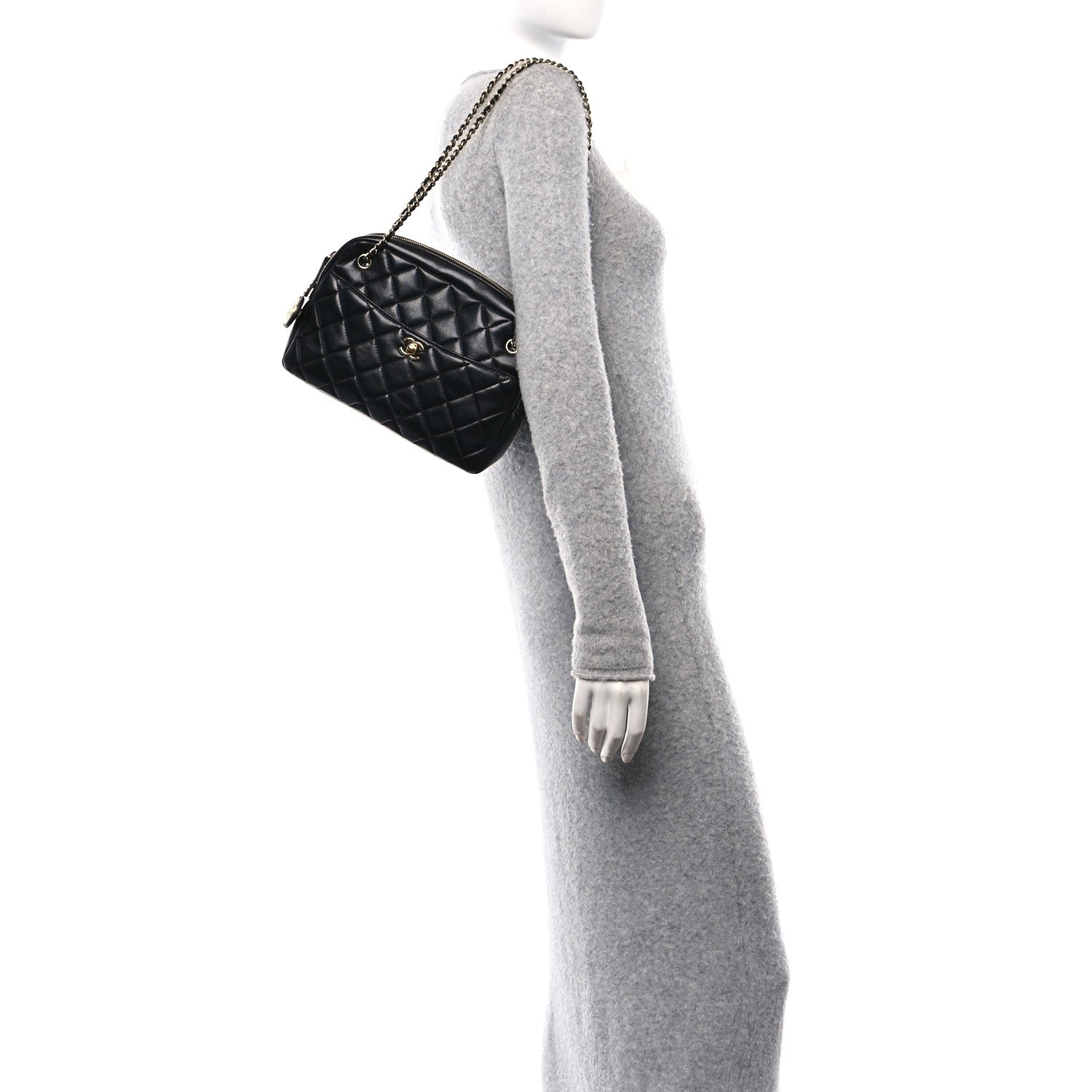 This is an authentic CHANEL Lambskin Quilted Medium Camera Case in Black. This versatile handbag is crafted of shiny black lambskin leather with diamond quilting. It features a magnetic rear pocket, a front pocket with gold-toned CC turn lock, and leather-threaded chain straps. The top zipper opens to a burgundy fabric interior with a zipper pocket and leather patch pocket.Follow this item for alerts. Chanel is a registered trademark of Chanel. FASHIONPHILE is not affiliated with Chanel.