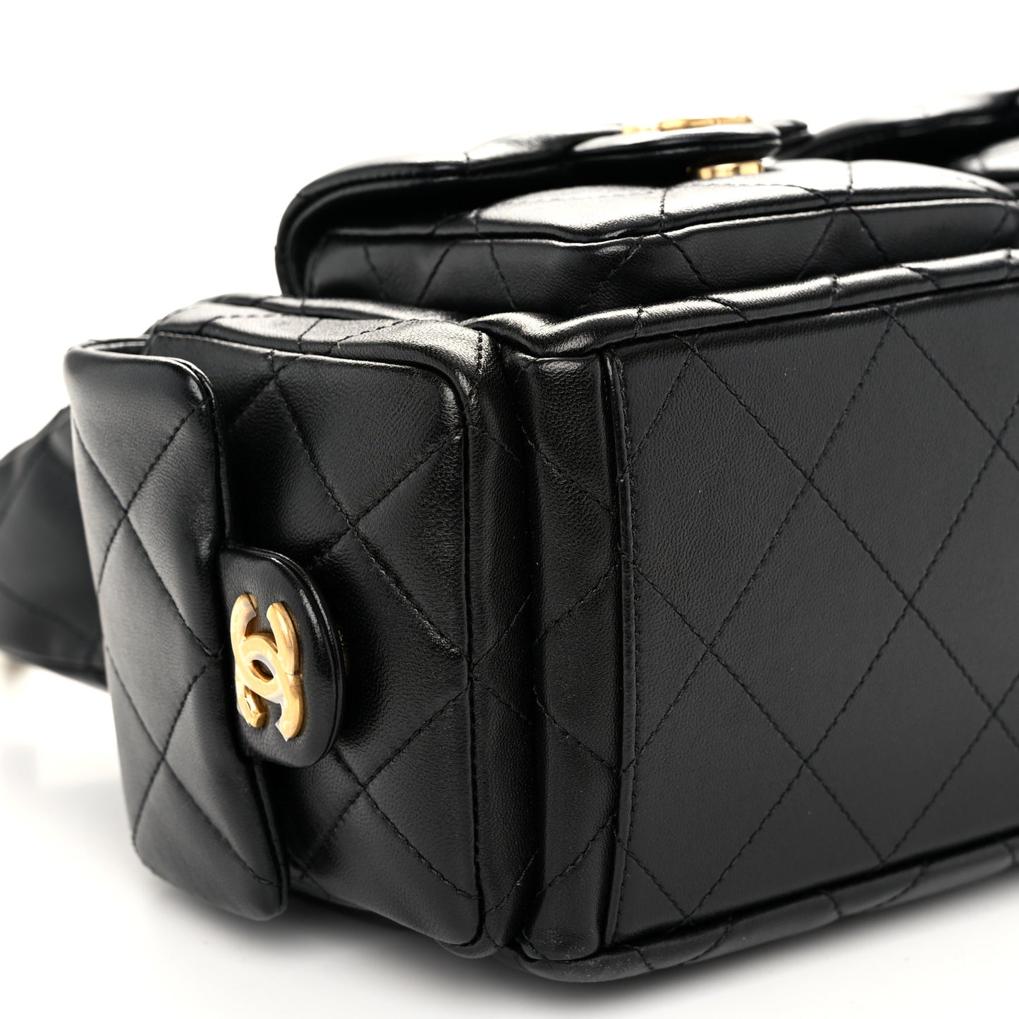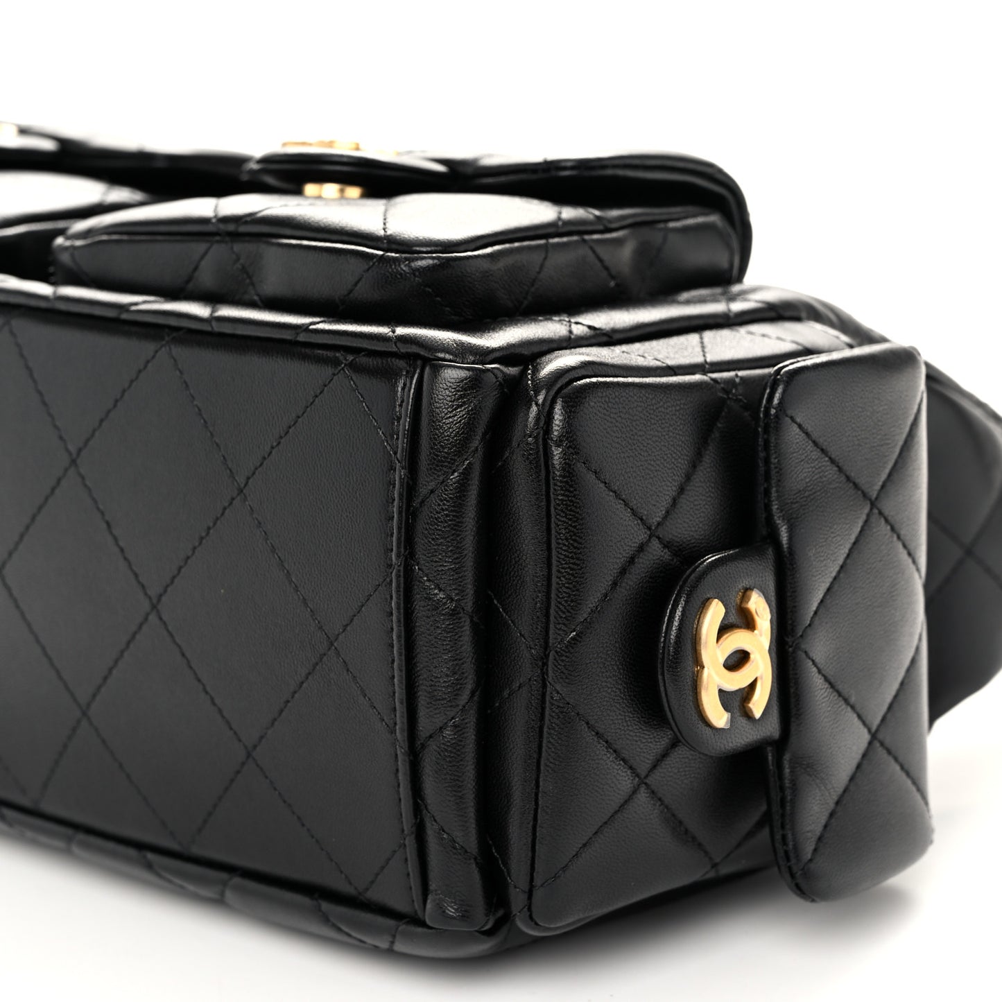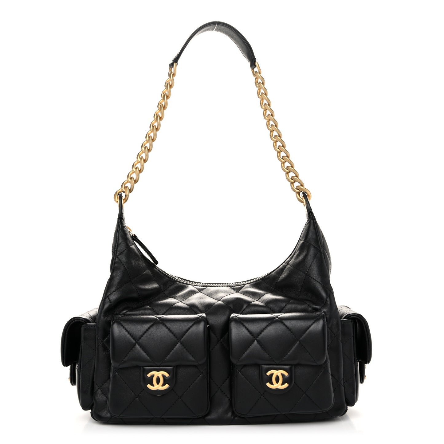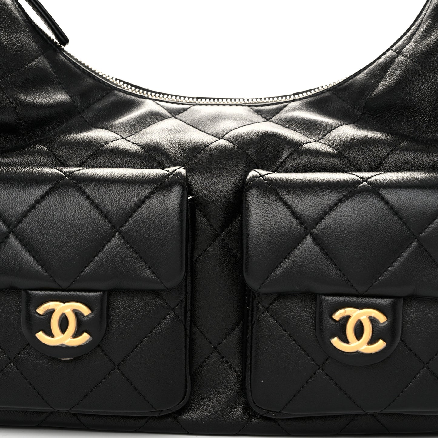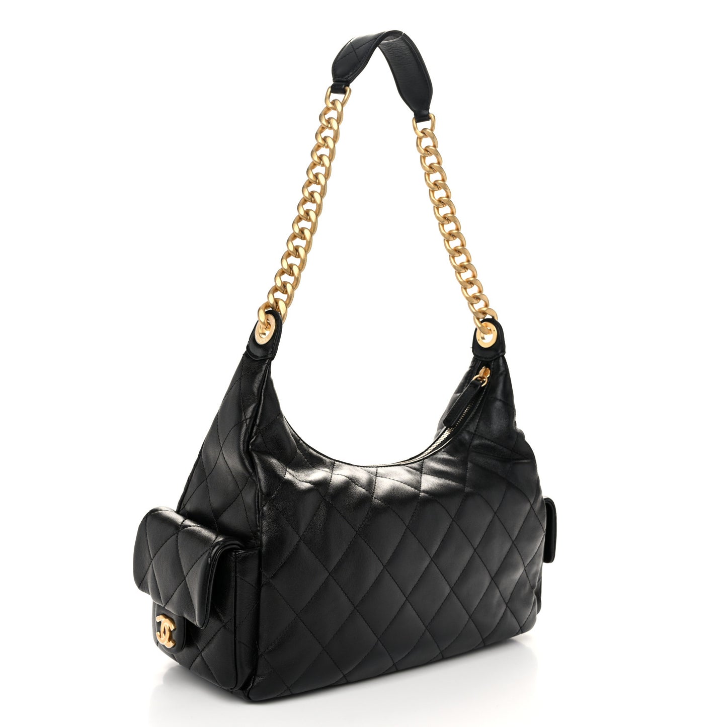 Shiny Lambskin Quilted Trendy Pockets Hobo Black