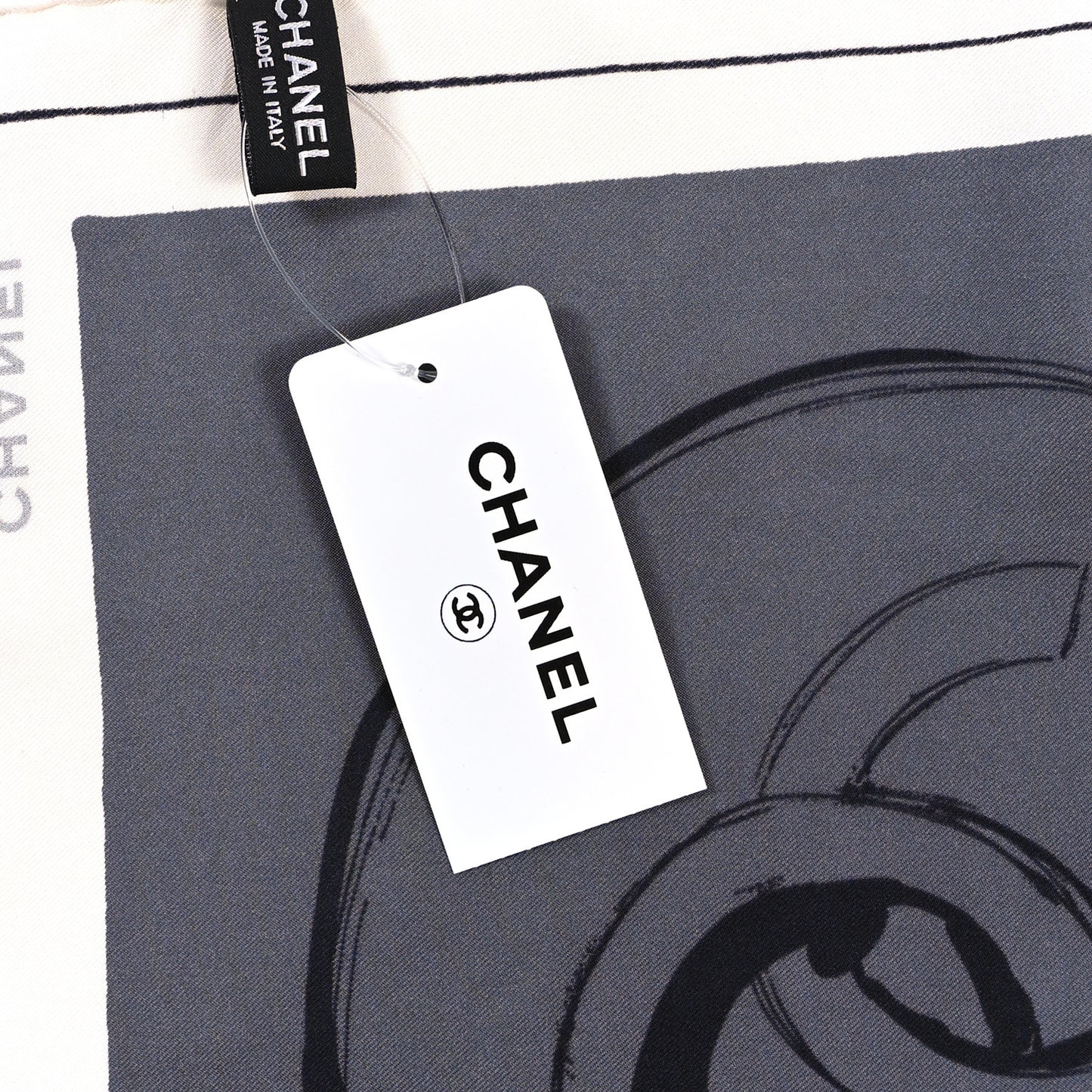 This is an authentic CHANEL Silk Camellia Jacket Flower Print Scarf in Dark White. This 100% silk scarf features a print of CCs, camellias, and jacket sketches on a white background.Follow this item for alerts. Chanel is a registered trademark of Chanel. FASHIONPHILE is not affiliated with Chanel.