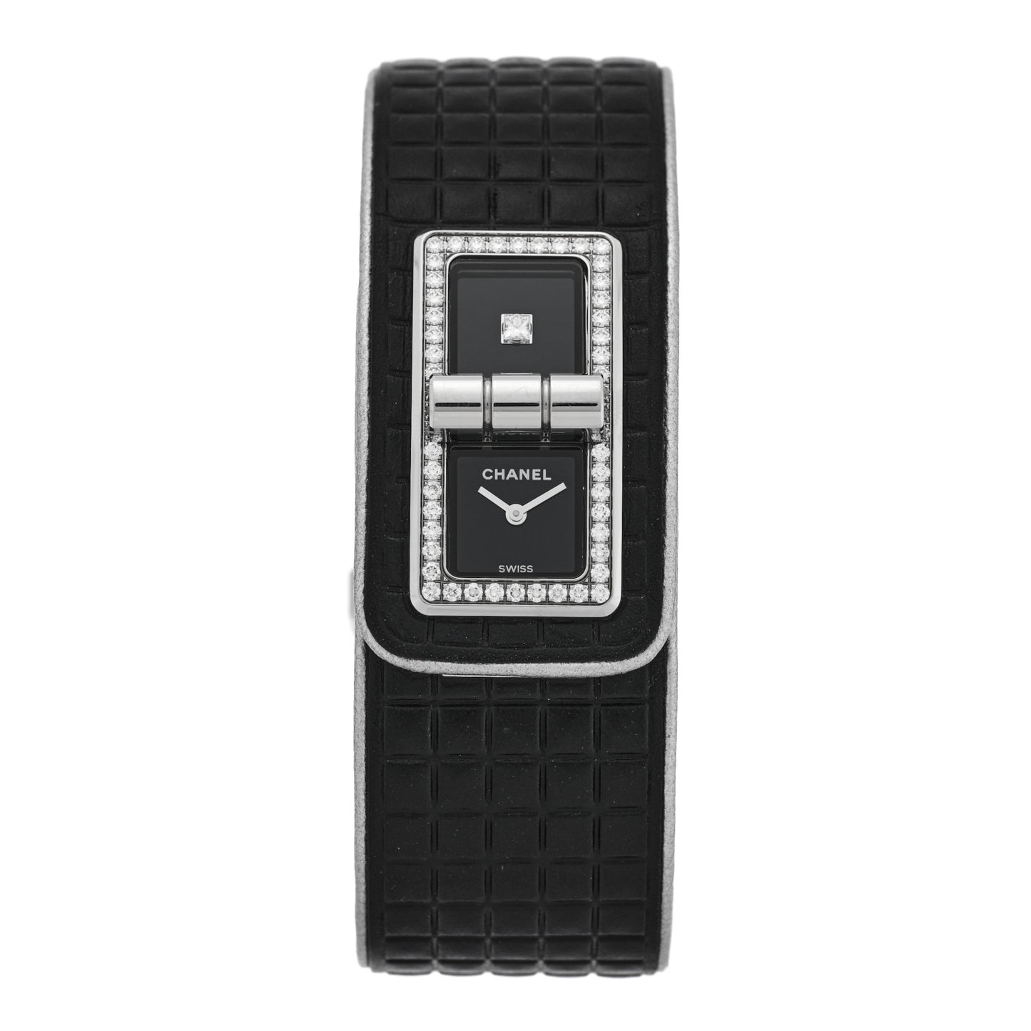 This is an authentic CHANEL Stainless Steel Calfskin Diamond Bezel 21mm Code Coco Quartz Watch Black. The watch is crafted of stainless steel and features a flexible calfskin band, black dial, diamond bezel, sapphire crystal, and a quartz movement.Follow this item for alerts. Chanel is a registered trademark of Chanel. FASHIONPHILE is not affiliated with Chanel.