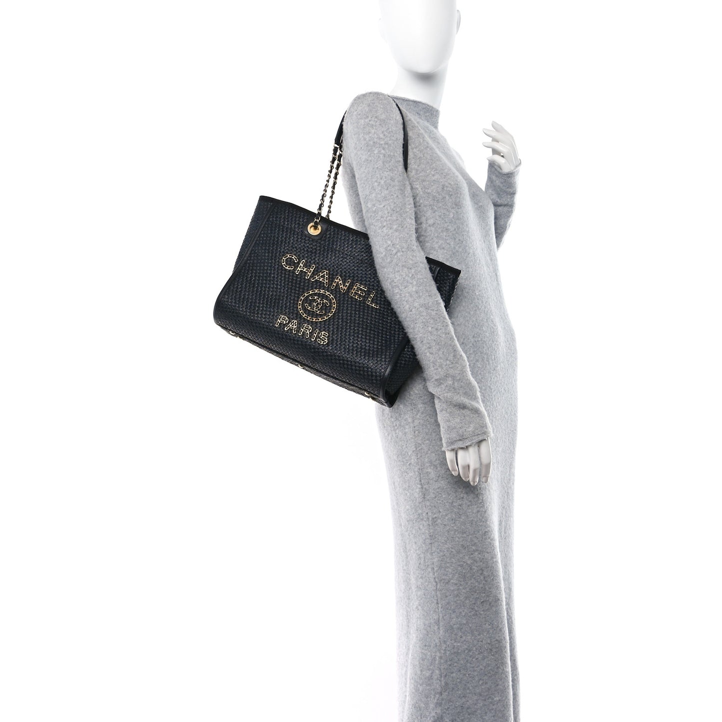 This is an authentic CHANEL Straw Raffia Calfskin Chain Small Deauville Tote in Black. This lovely tote is crafted of fine woven raffia printed with a stitched black Chanel logo. The bag features gold threaded shoulder straps with black leather shoulder pads, darker canvas trim and an open top. The bag opens to spacious dark denim fabric interior with zipper and patch pockets.Follow this item for alerts. Chanel is a registered trademark of Chanel. FASHIONPHILE is not affiliated with Chanel.