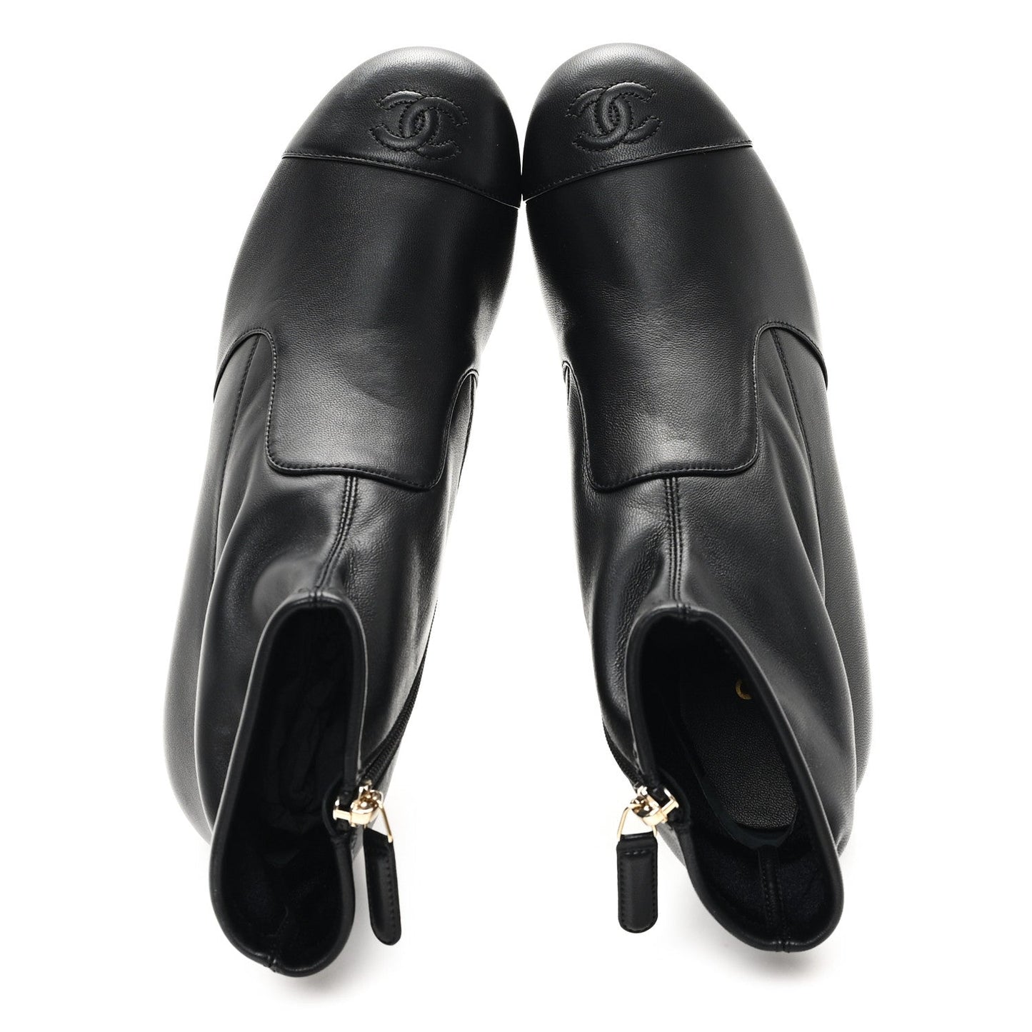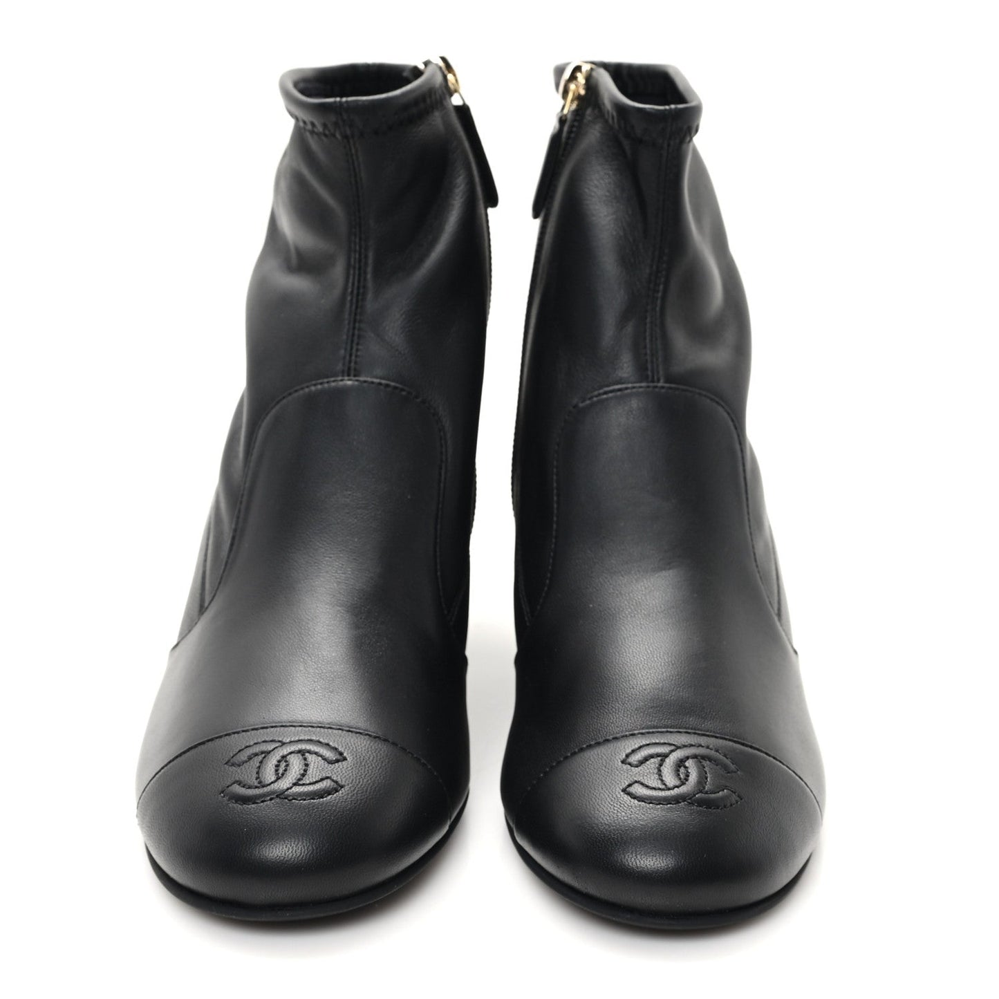 This is an authentic pair of Stretch Lambskin Cap Toe CC Short Boots size 38 in Black. These boots are crafted of stretch lambskin leather in black with side zippers and black cap toes. They feature 2-inch heels and black soles.Follow this item for alerts. Chanel is a registered trademark of Chanel. FASHIONPHILE is not affiliated with Chanel.