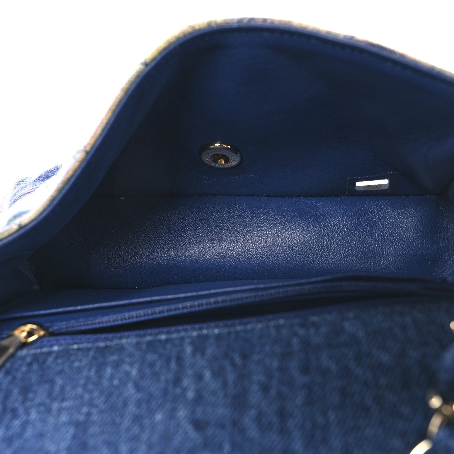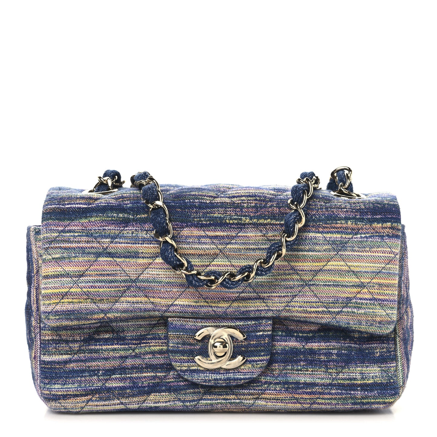 This is an authentic CHANEL Striated Denim Quilted Classics in Fabrics Mini Rectangular Flap in Navy, Yellow, Purple, Green, and Multicolor. This chic mini crossbody classic is crafted of quilted denim fabric in blue with multiple colors mixed in throughout. The bag features a polished light gold tone chain link fabric threaded shoulder strap and a facing polished light gold tone Classic CC turn lock. This opens the flap to a blue leather interior with a zipper and patch pocket.Follow this item for alerts. Chanel is a registered trademark of Chanel. FASHIONPHILE is not affiliated with Chanel.
