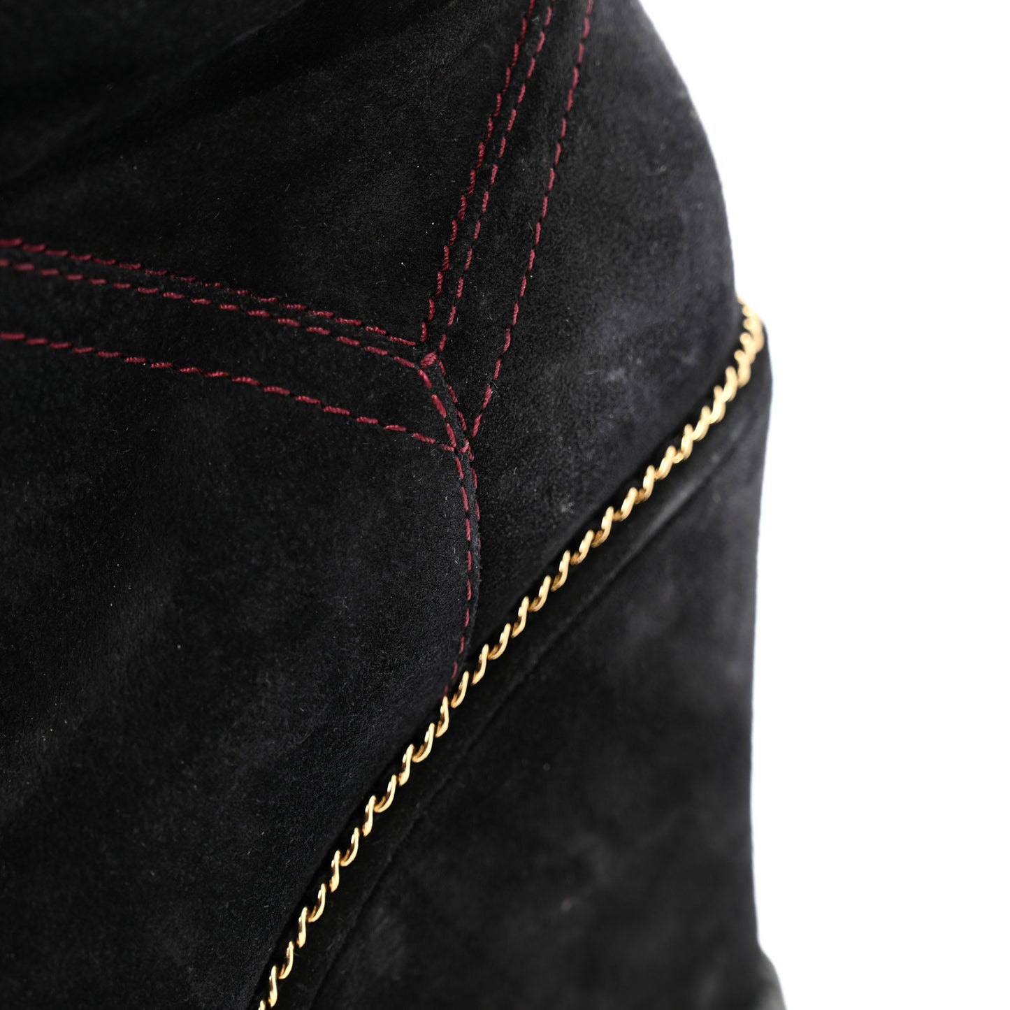 This is an authentic pair of CHANEL Suede Calfskin Chain Around High Boots size 41 in Black. These stunning boots are crafted of suede leather in black, with pink contrast stitching. They fall just below the knee and feature a 3.75-inch wedge heel, gold chain detail around the midsole, and a small gold CC logo at the ankle.Follow this item for alerts. Chanel is a registered trademark of Chanel. FASHIONPHILE is not affiliated with Chanel.