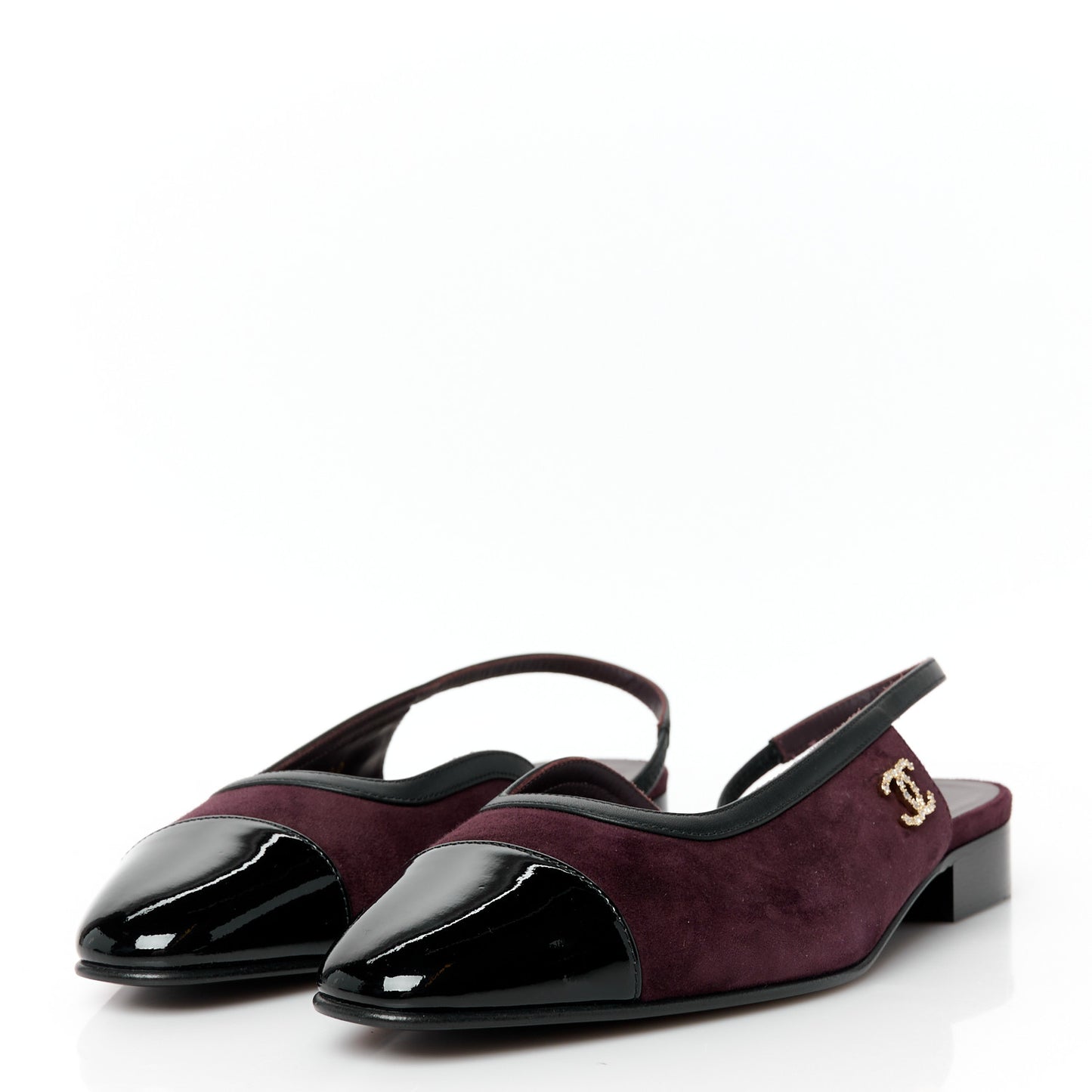 This is an authentic pair of CHANEL Suede Patent Cap Toe CC Coco Slingback Flats size 37.5 in Burgundy and Black. These flats are crafted of burgundy suede with black patent leather cap toes. They feature black leather trim with elastic ankle straps and crystal CC logos at the sides.Follow this item for alerts. Chanel is a registered trademark of Chanel. FASHIONPHILE is not affiliated with Chanel.