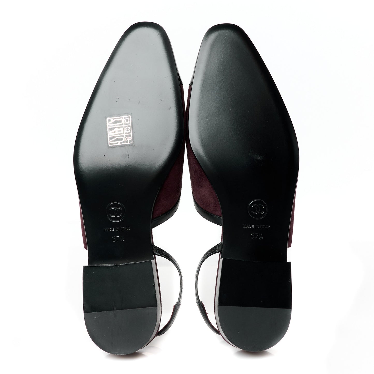 Chanel/ Accessories/ Shoes /Chanel Suede Patent Crystal CC Cap Toe Slingback Flats 37.5 Burgundy Black