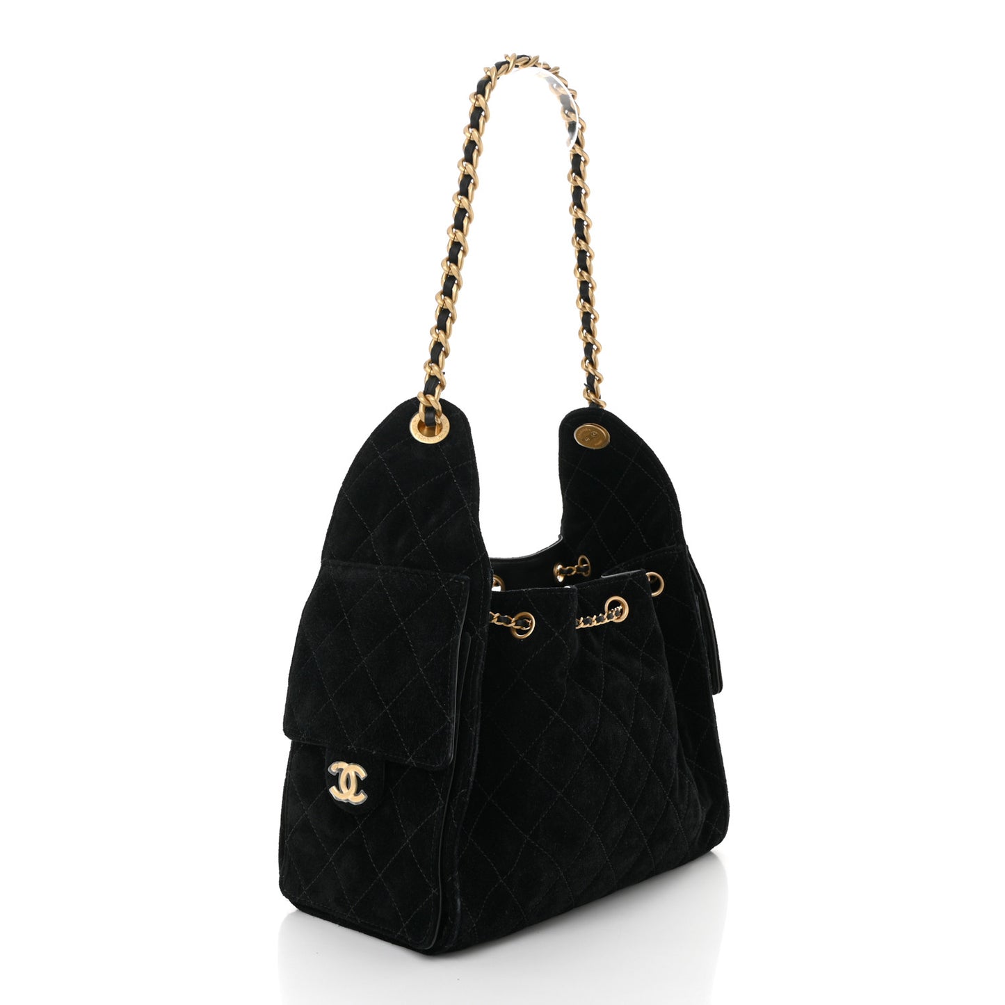 This is an authentic Chanel Suede Quilted Small Chanel 25 Handbag Black. This chic shoulder bag is crafted of diamond-stitched Suede leather in black. It features a gold chain leather threaded shoulder strap and two side pockets with an aged gold CC logo, The top opens to a green fabric interior with a leather patch pocket.Follow this item for alerts. Chanel is a registered trademark of Chanel. FASHIONPHILE is not affiliated with Chanel.