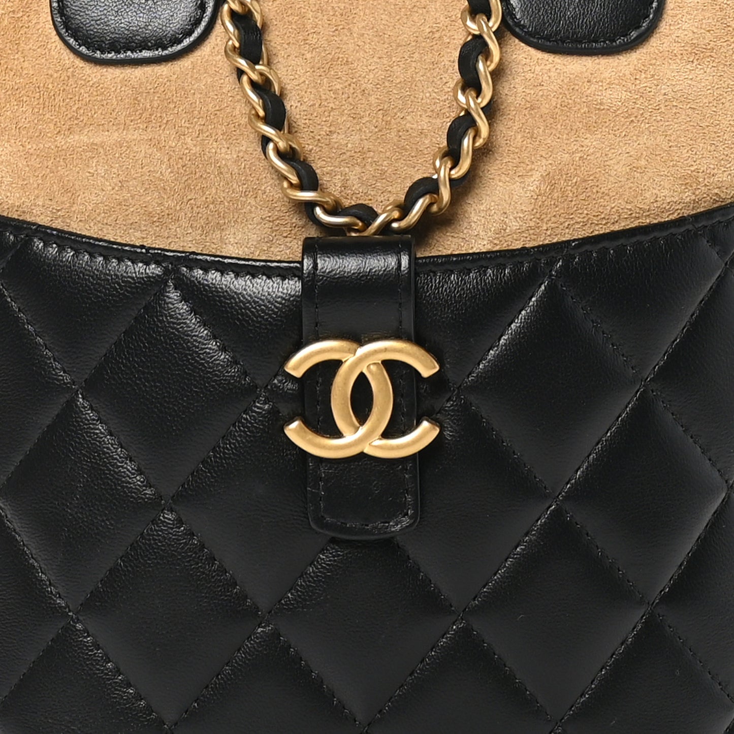 This is an authentic CHANEL Suede Shiny Lambskin Quilted Top Handle Clutch With Chain in Black and Beige. This handbag is crafted of diamond quilted black lambskin leather and beige suede leather trim. It features a front patch pocket, leather top handles, a leather-threaded chain strap, and a gold-toned CC logo on the front. The top zipper opens to a black fabric interior with leather card slots.Follow this item for alerts. Chanel is a registered trademark of Chanel. FASHIONPHILE is not affiliated with Chanel.