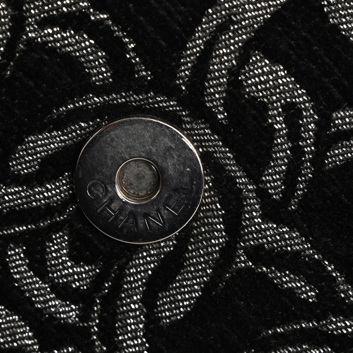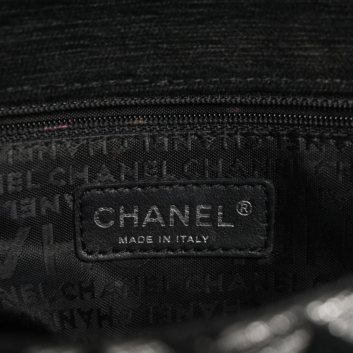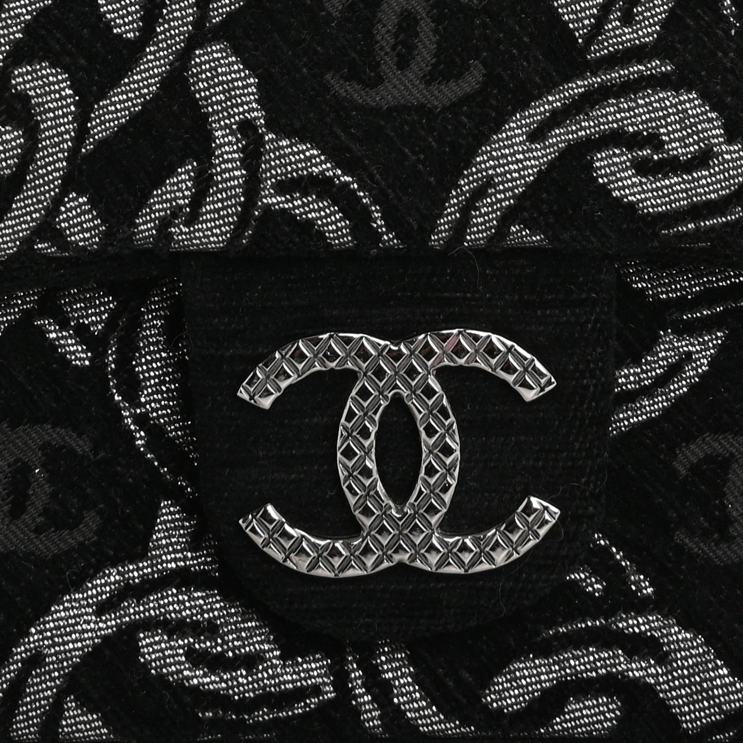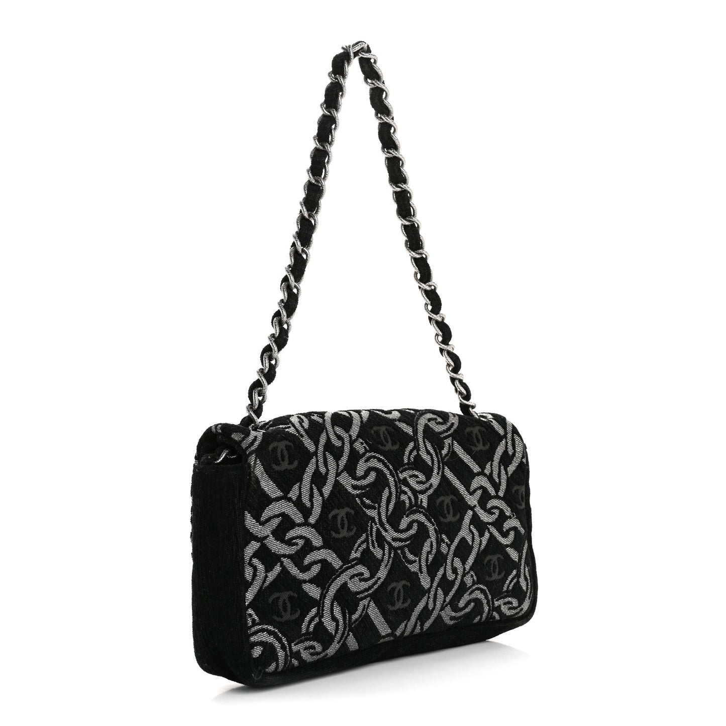 This is an authentic CHANEL Tweed CC Cruise Chain Flap in Black and Silver. This chic clutch is crafted of soft diamond quilted canvas with a silver Chanel Cruise chain print on the crossover flap. The flap opens to a black canvas interior with a zipper pocket and room enough for all of your day or evening necessities with the timeless style of Chanel!Follow this item for alerts. Chanel is a registered trademark of Chanel. FASHIONPHILE is not affiliated with Chanel.
