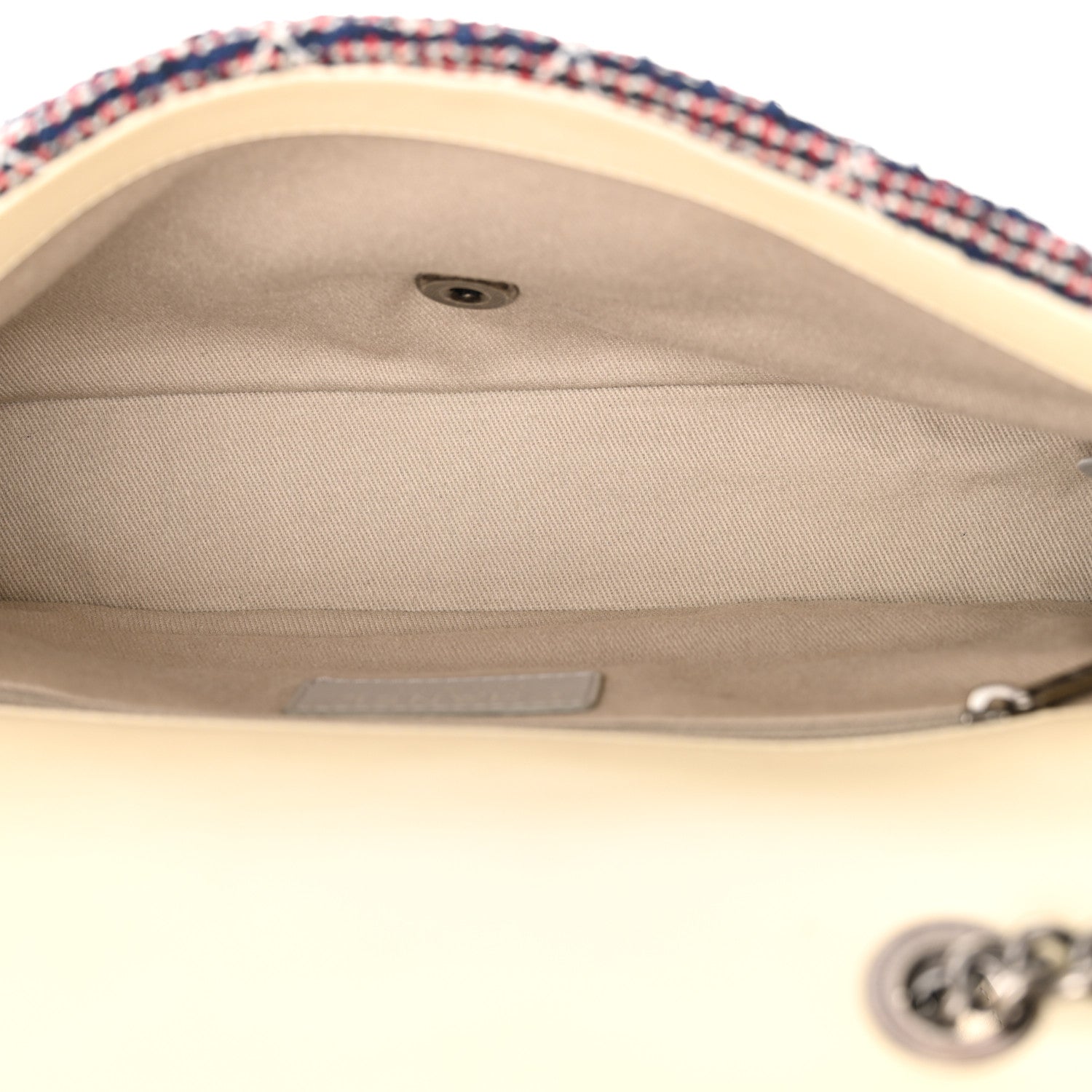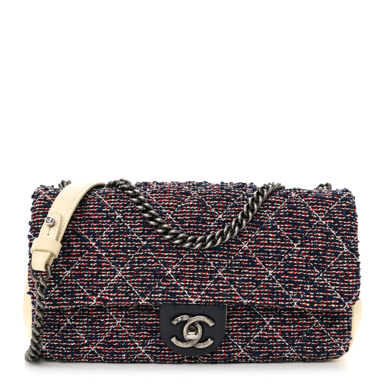 This is an authentic CHANEL Tweed Quilted Medium Single Flap in Blue and Multicolor. This bold shoulder bag is crafted of red, white, and blue woven tweed, with white leather trim. The handbag features a ruthenium chain shoulder strap and a ruthenium classic Chanel CC turn-lock for the facing flap. This opens to a fabric interior with a zipper pocket.Follow this item for alerts. Chanel is a registered trademark of Chanel. FASHIONPHILE is not affiliated with Chanel.