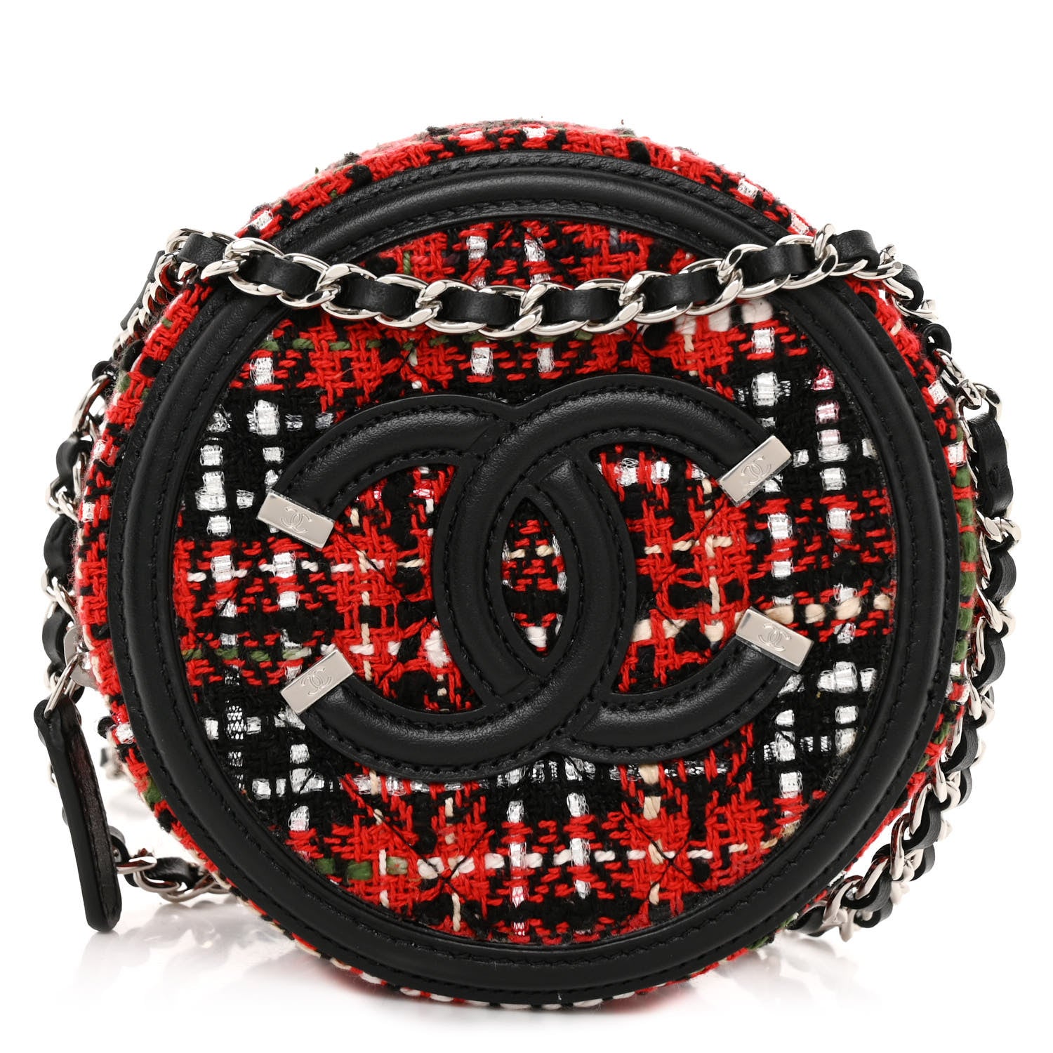 This is an authentic CHANEL Tweed Quilted Round Filigree Clutch With Chain in Red and Black. This stylish crossbody bag is crafted of luxurious red multicolored tweed. The bag features a silver chain leather threaded shoulder strap and a black leather Chanel CC logo on the front with polished silver tips. The zipper opens to a black fabric interior with patch pockets.Follow this item for alerts. Chanel is a registered trademark of Chanel. FASHIONPHILE is not affiliated with Chanel.