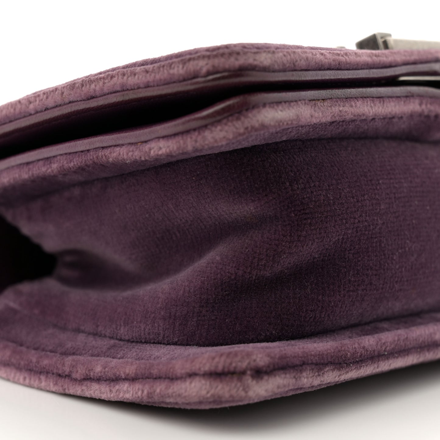 This is an authentic CHANEL Velvet Quilted Mini Boy Flap in Purple. This stylish bag is crafted of diamond quilted velvet in purple with a peripheral quilt. It features a ruthenium chain link shoulder strap with a leather shoulder pad and a squared Chanel CC Boy press lock. This opens to a gray fabric interior with a patch pocket.Follow this item for alerts. Chanel is a registered trademark of Chanel. FASHIONPHILE is not affiliated with Chanel.