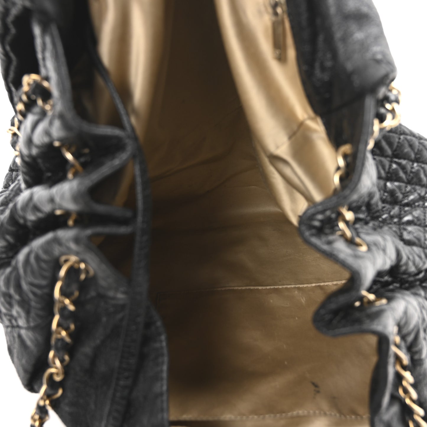 This is an authentic CHANEL Vinyl XL Rock and Chain Flap in Black. This shoulder bag is crafted of black vinyl with a large CC logo stitched on the crossover flap. The bag features diamond quilting on the sides and a gold chain shoulder strap with black vinyl threading. The flap opens to a gold satin interior with zipper and patch pockets and key strap.Follow this item for alerts. Chanel is a registered trademark of Chanel. FASHIONPHILE is not affiliated with Chanel.