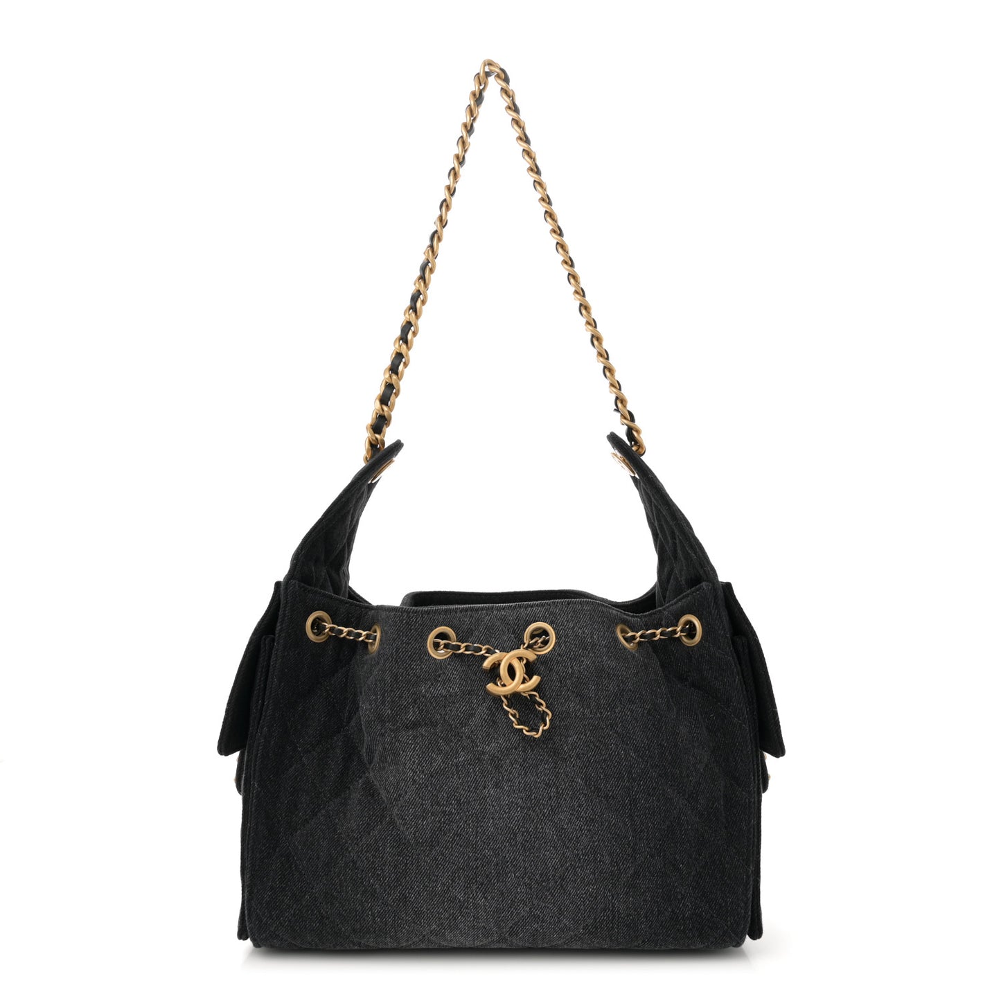 This is an authentic Chanel Washed Denim Quilted Small Chanel 25 Handbag in Black. This chic shoulder bag is crafted of diamond-stitched washed denim in black. It features an aged gold chain leather threaded shoulder strap with a shoulder pad and two side pockets with an aged gold CC logo. The top opens to a black fabric interior with a small patch pocket.Follow this item for alerts. Chanel is a registered trademark of Chanel. FASHIONPHILE is not affiliated with Chanel.