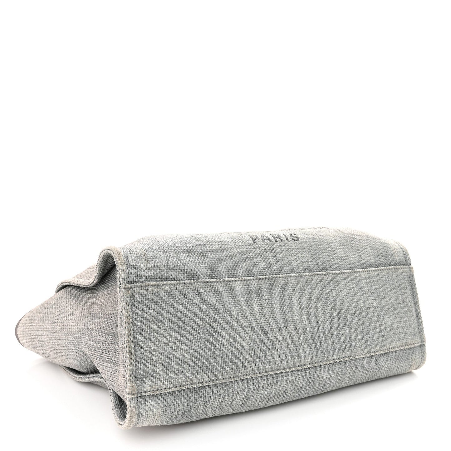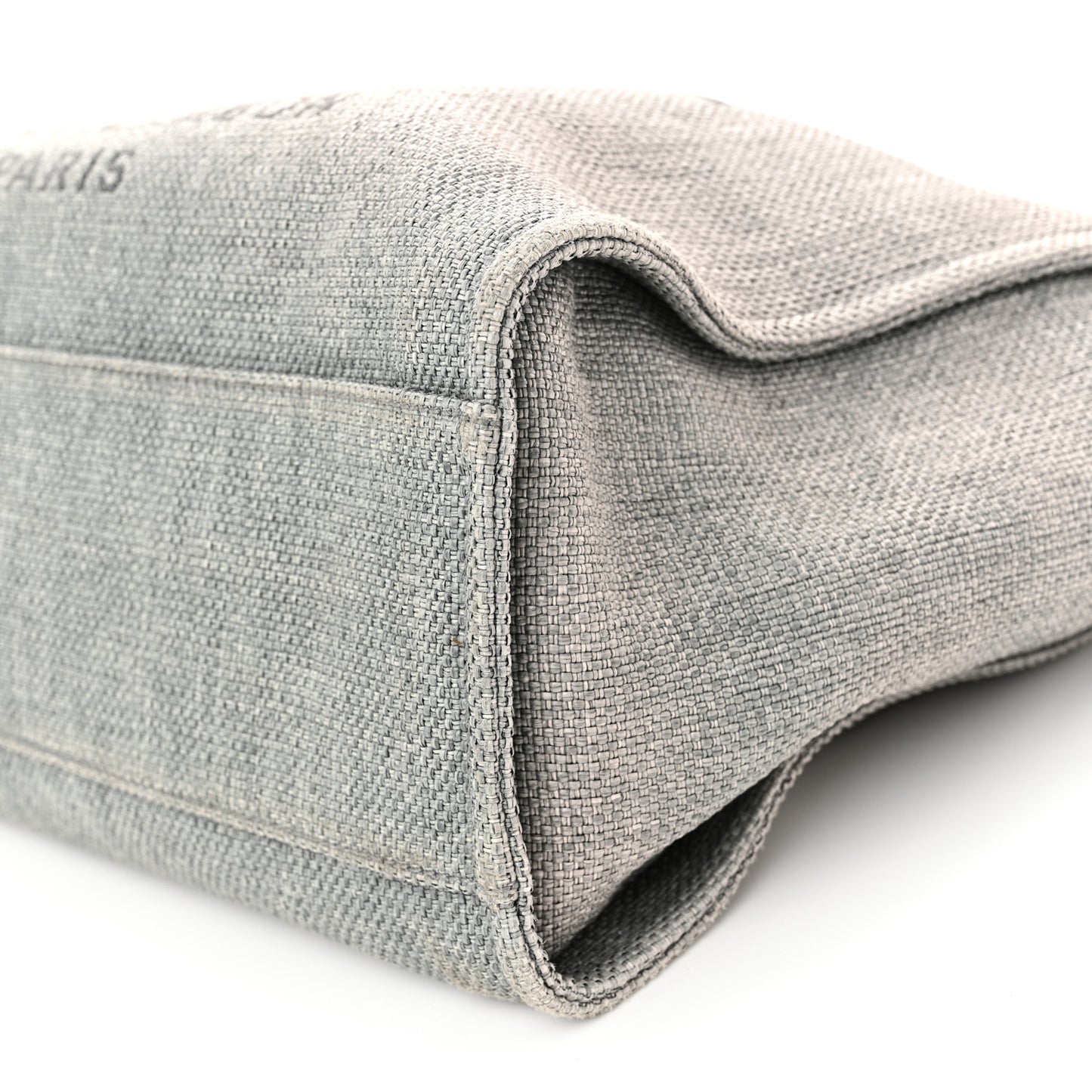 This is an authentic CHANEL Woven Straw Raffia Large Deauville Tote in Grey. This lovely woven light grey tote is crafted of fine raffia with an iconic Chanel logo in grey. The bag features canvas threaded silver chain shoulder straps, grey leather top handles, and grey canvas trim. The open top leads to a grey fabric interior features zipper and patch pockets.Follow this item for alerts. Chanel is a registered trademark of Chanel. FASHIONPHILE is not affiliated with Chanel.