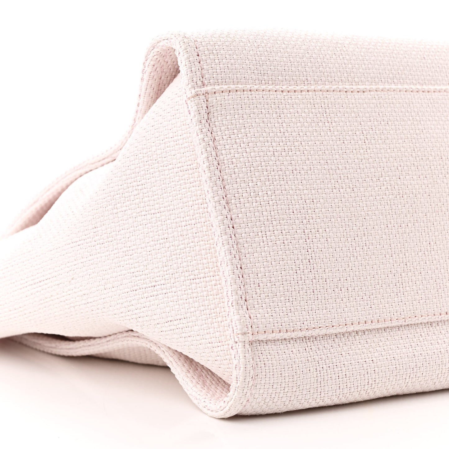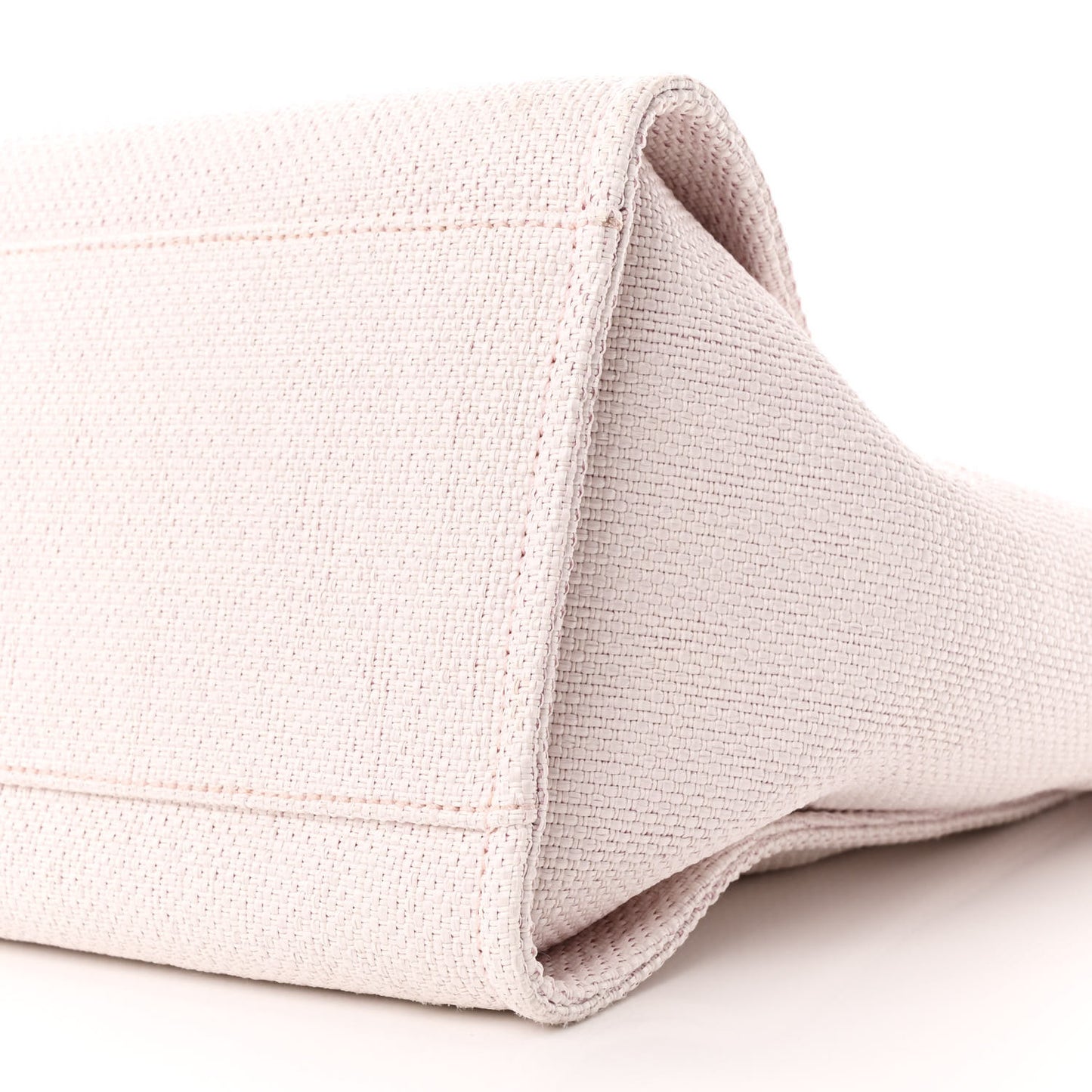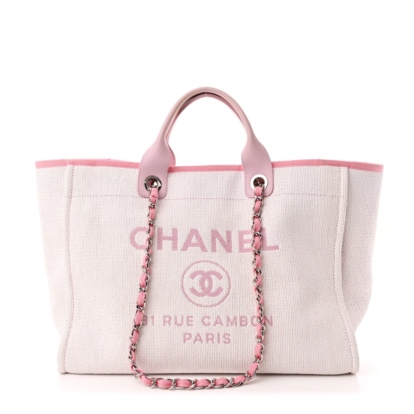 This is an authentic CHANEL Woven Straw Raffia Medium Deauville Tote in Pink. This tote is crafted of fine raffia in light pink printed with a historic advertisement logo. The bag features rolled pink leather top handles, pink fabric-threaded silver chain shoulder straps, and a matching fabric top edge. The top opens to a spacious fabric interior with zipper and patch pockets.Follow this item for alerts. Chanel is a registered trademark of Chanel. FASHIONPHILE is not affiliated with Chanel.