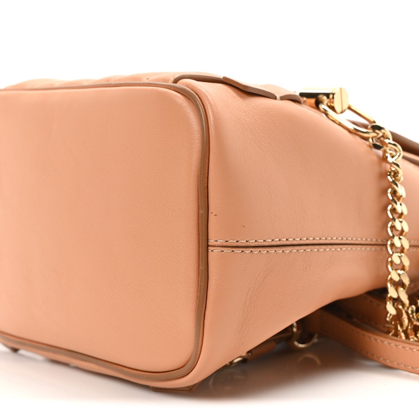 This is an authentic CHLOE Calfskin Quilted Mini Faye Backpack in Blushy Pink. This stylish backpack is crafted of tan quilted and smooth calfskin leather. The bag features adjustable leather shoulder straps, a leather flap, an additional single shoulder strap, and has a decorative draping gold-tone chain with a silver clips that attaches to gold ring closure. The flap opens to a beige fabric interior with a patch pocket.Follow this item for alerts. Chloe is a registered trademark of Chloe. FASHIONPHILE is not affiliated with Chloe.