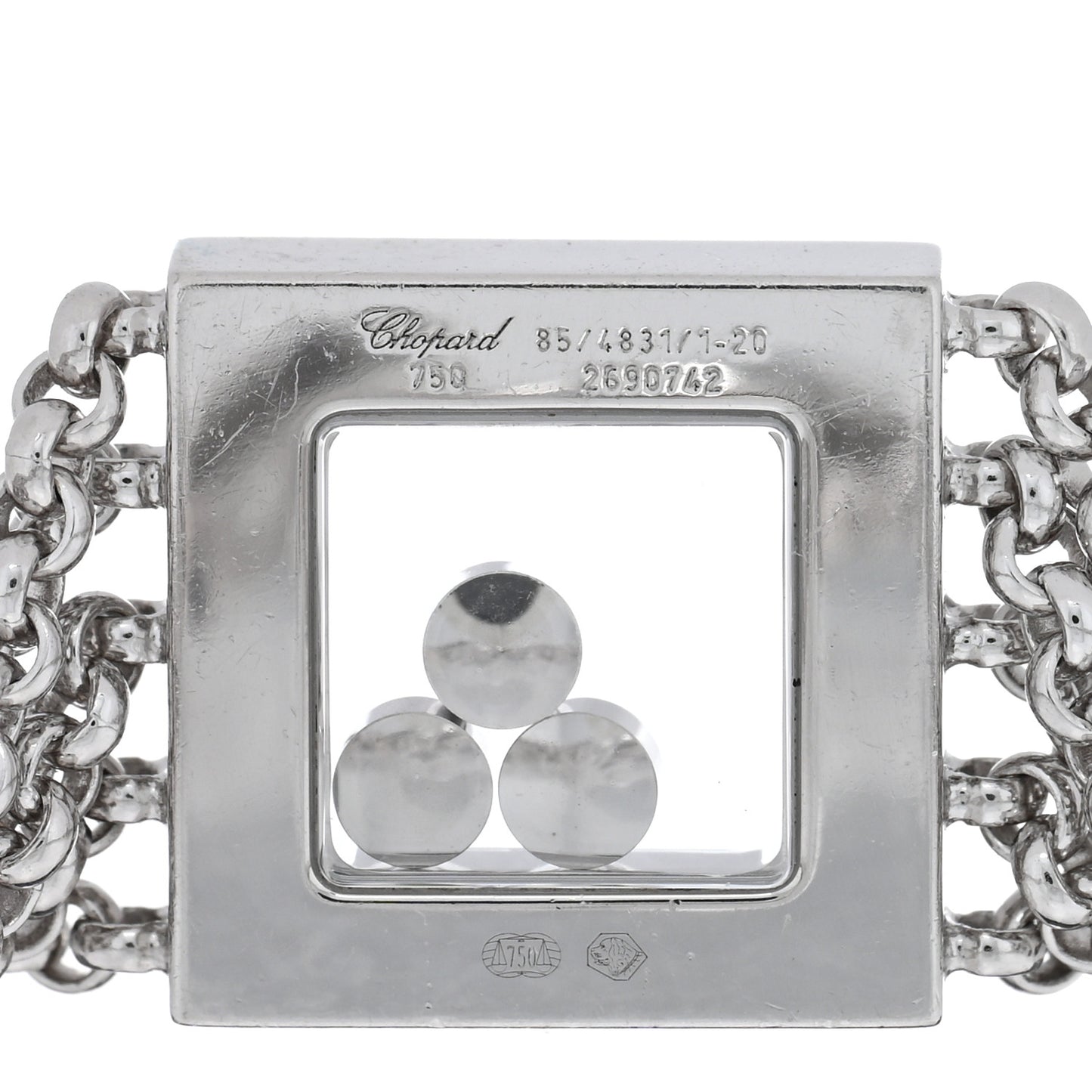 This is an authentic CHOPARD 18K White Gold Diamond Ruby Happy Diamonds Curve Bracelet. The bracelet is crafted of 18 karat white gold and features a square station with floating gemstones, including rubies and approximately 1.30 total carat weight of diamonds throughout the bracelet.Follow this item for alerts. Chopard is a registered trademark of Chopard. FASHIONPHILE is not affiliated with Chopard.