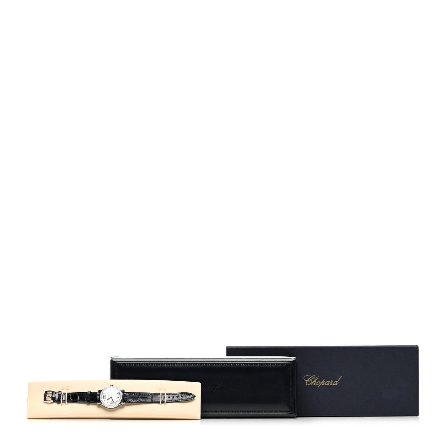 This is an authentic CHOPARD Stainless Steel Alligator Diamond Bezel 33mm Happy Sport Automatic Watch. The watch is crafted of stainless steel and features a silver dial, five floating diamonds, sapphire crystal, blue alligator strap, and an automatic movement.Follow this item for alerts. Chopard is a registered trademark of Chopard. FASHIONPHILE is not affiliated with Chopard.