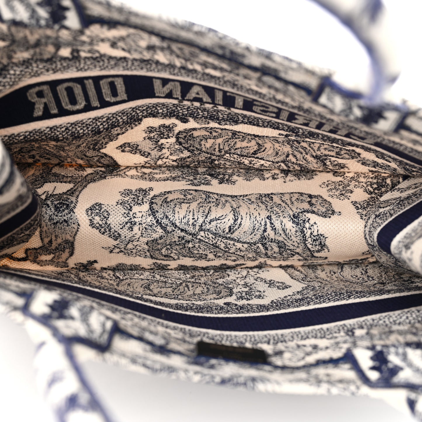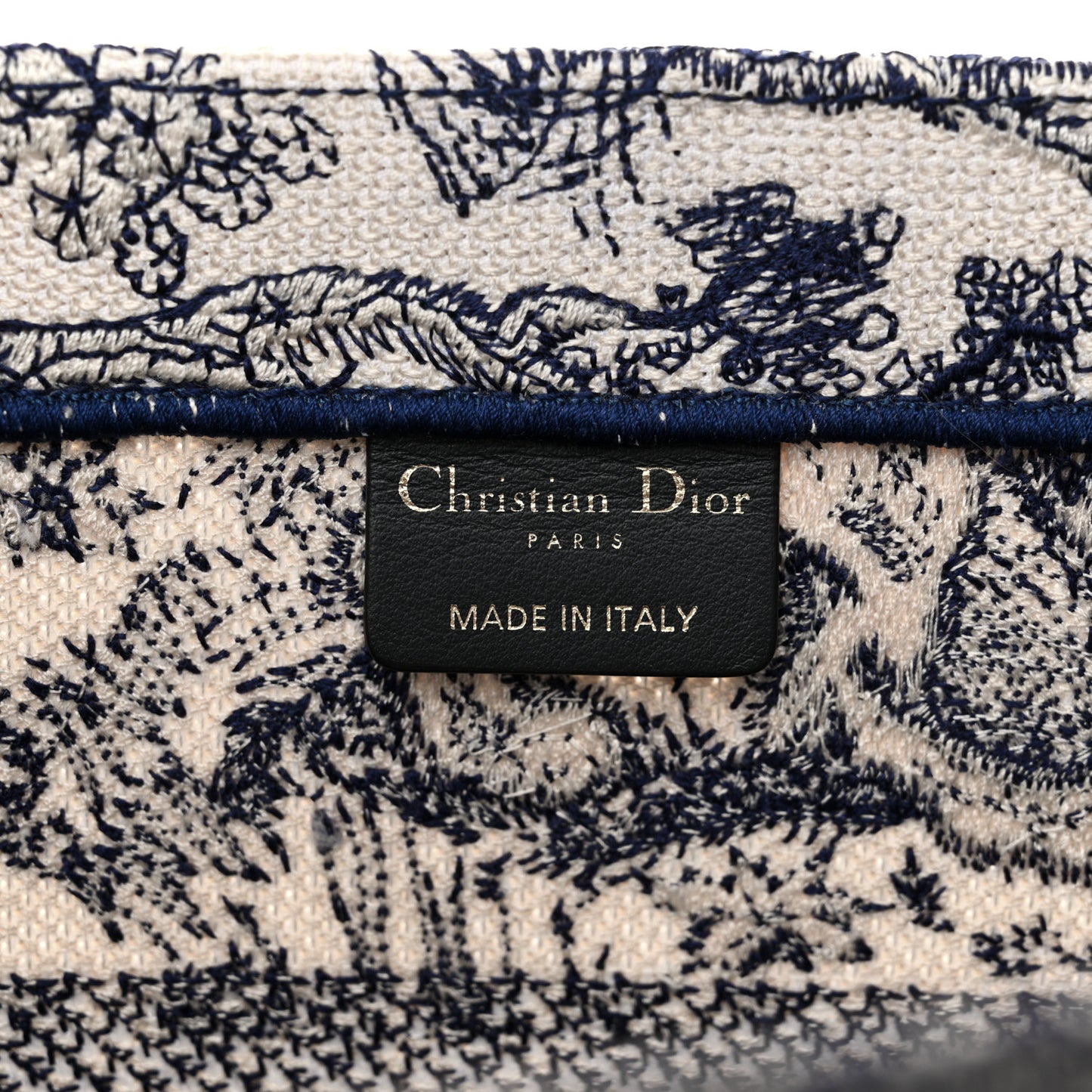 This is an authentic CHRISTIAN DIOR Canvas Embroidered Medium Dioriviera Toile De Jouy Book Tote in Blue. This tote is finely crafted of embroidered canvas with a bold jungle graphic in blue. It features matching canvas rolled top handles, with the CHRISTIAN DIOR logo embroidered across the front in white. The bag opens to a spacious unlined fabric interior.Follow this item for alerts. Christian Dior is a registered trademark of Christian Dior. FASHIONPHILE is not affiliated with Christian Dior.