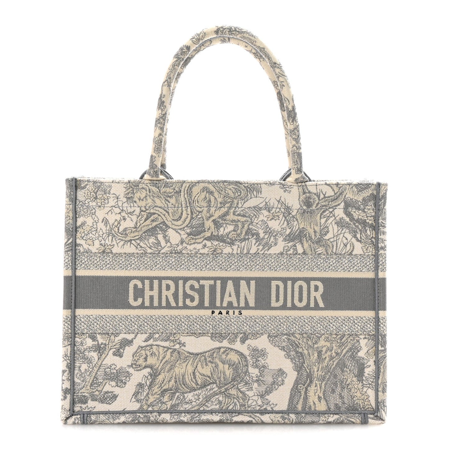 This is an authentic CHRISTIAN DIOR Canvas Embroidered Medium Dioriviera Toile De Jouy Book Tote in Gray. This colorful tote is finely crafted of embroidered canvas with a bold jungle graphic in grey. The bag features matching canvas rolled handles, with the CHRISTIAN DIOR logo embroidered across the front. The bag opens to a spacious fabric interior.Follow this item for alerts. Christian Dior is a registered trademark of Christian Dior. FASHIONPHILE is not affiliated with Christian Dior.