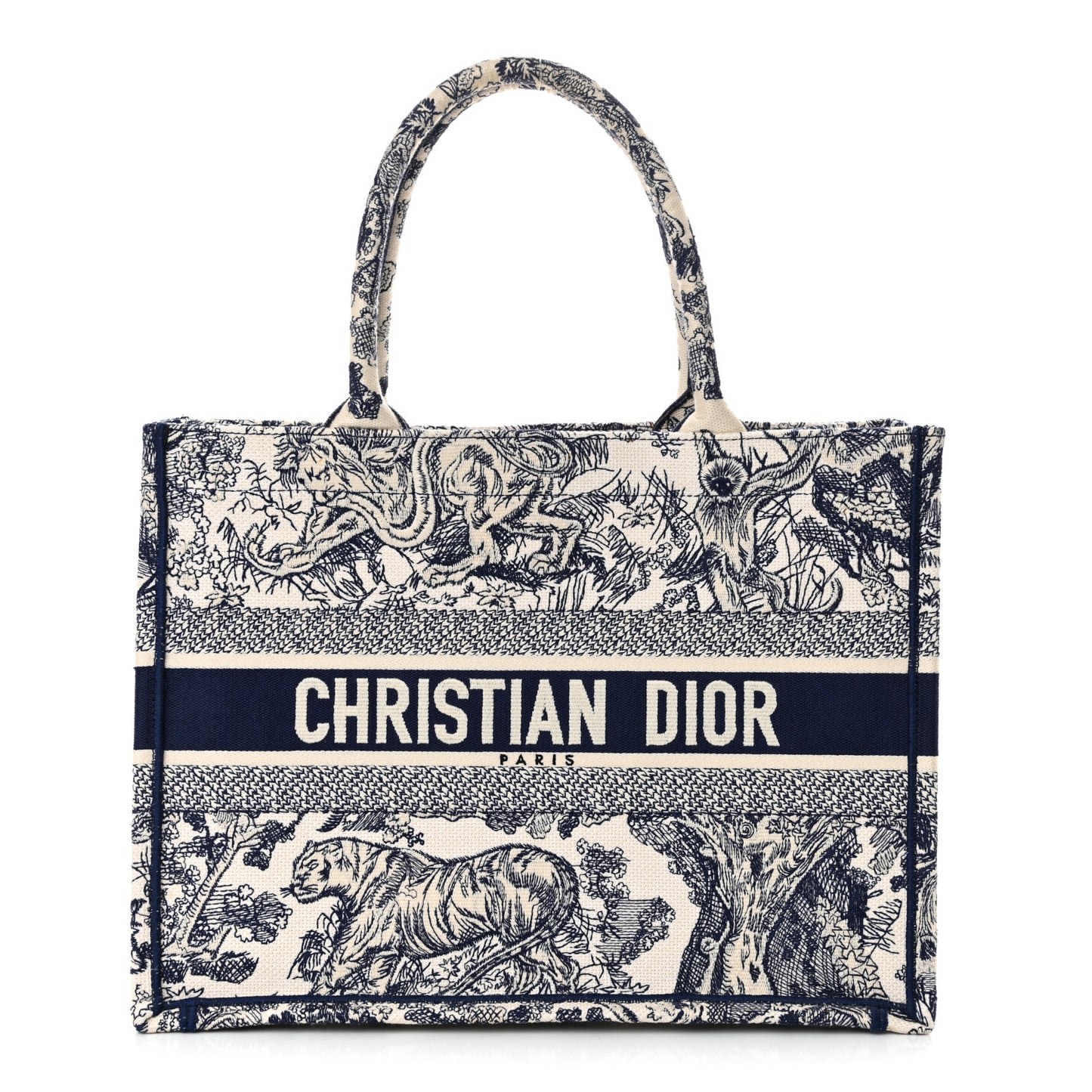 This is an authentic CHRISTIAN DIOR Canvas Embroidered Medium Dioriviera Toile De Jouy Reverse Book Tote in Blue. This tote is finely crafted of embroidered canvas with a bold jungle graphic in blue. It features matching canvas rolled top handles, with the CHRISTIAN DIOR logo embroidered across the front in white. The bag opens to a spacious unlined fabric interior.Follow this item for alerts. Christian Dior is a registered trademark of Christian Dior. FASHIONPHILE is not affiliated with Christian Dior.