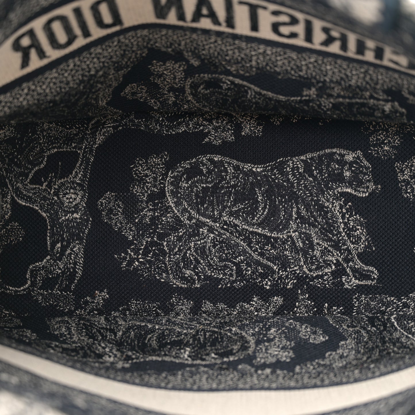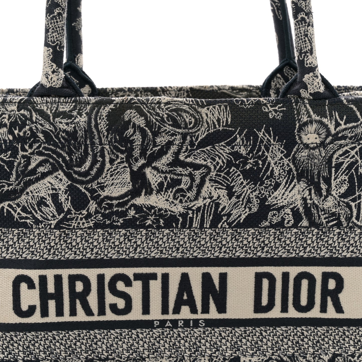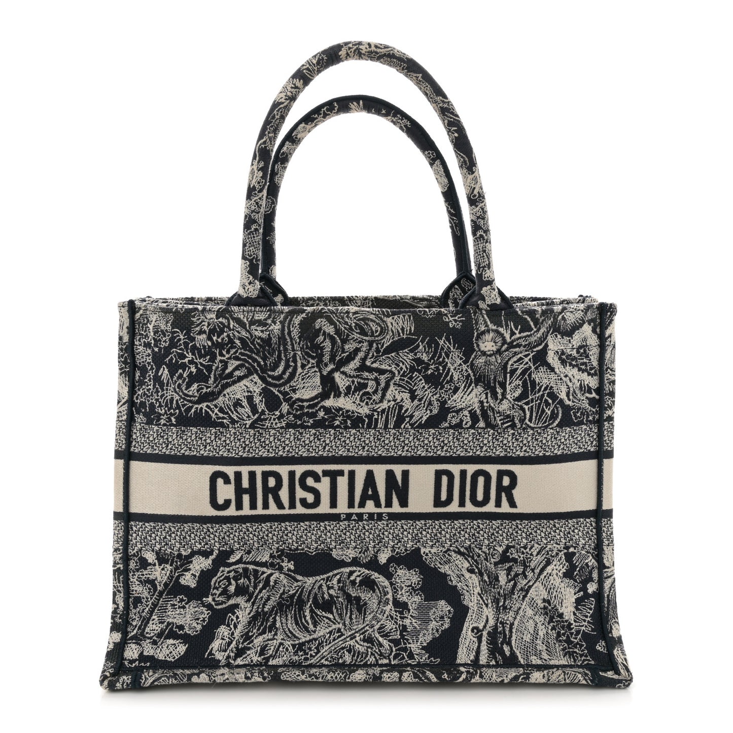 This is an authentic CHRISTIAN DIOR Canvas Embroidered Medium Toile De Jouy Reverse Book Tote in Blue. This stunning tote is finely crafted of embroidered canvas with a bold jungle graphic in blue and white. The bag features matching canvas rolled handles and a CHRISTIAN DIOR logo embroidered across the front. The bag opens to a spacious fabric interior.Follow this item for alerts. Christian Dior is a registered trademark of Christian Dior. FASHIONPHILE is not affiliated with Christian Dior.
