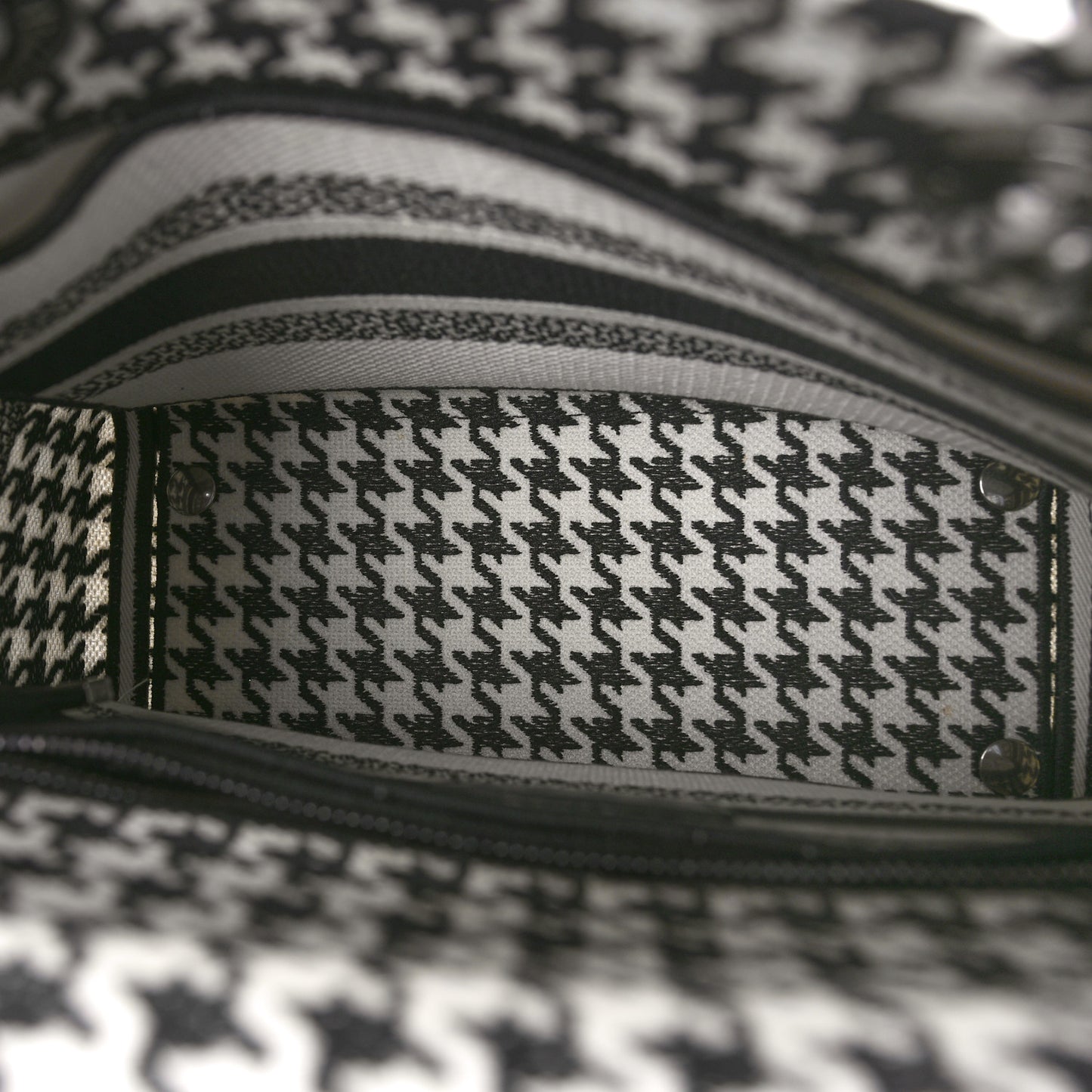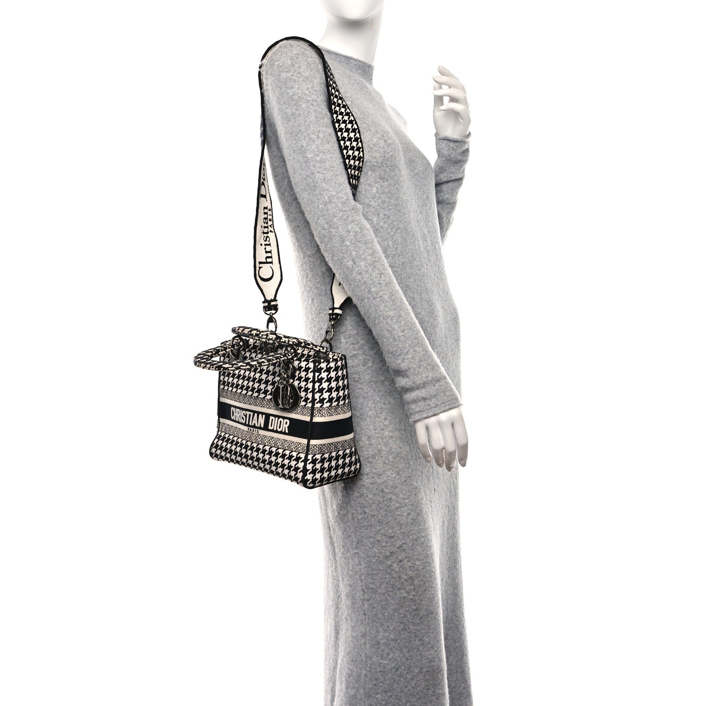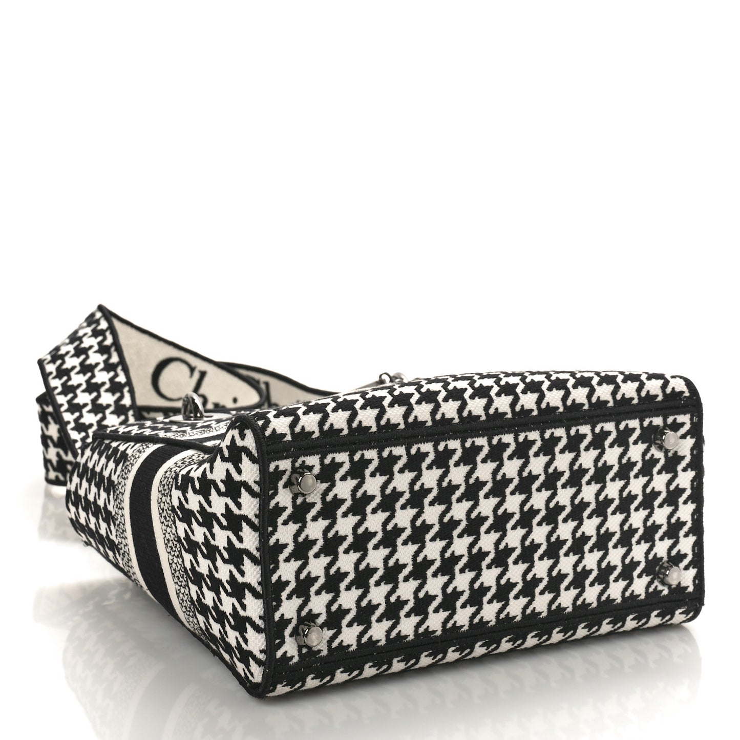 This is an authentic CHRISTIAN DIOR Canvas Houndstooth Embroidered Medium Lady D-Lite in Black and White. This stylish handbag tote is finely crafted of embroidered white and black Cannage canvas with a unique print and the 'Christian Dior' signature on the front. The bag features fabric top handles, an optional shoulder strap with gold hardware, including gold Dior letters charm. The top opens to a matching fabric interior with a hanging zipper pocket as well as a patch pocket.Follow this item for alerts. Christian Dior is a registered trademark of Christian Dior. FASHIONPHILE is not affiliated with Christian Dior.