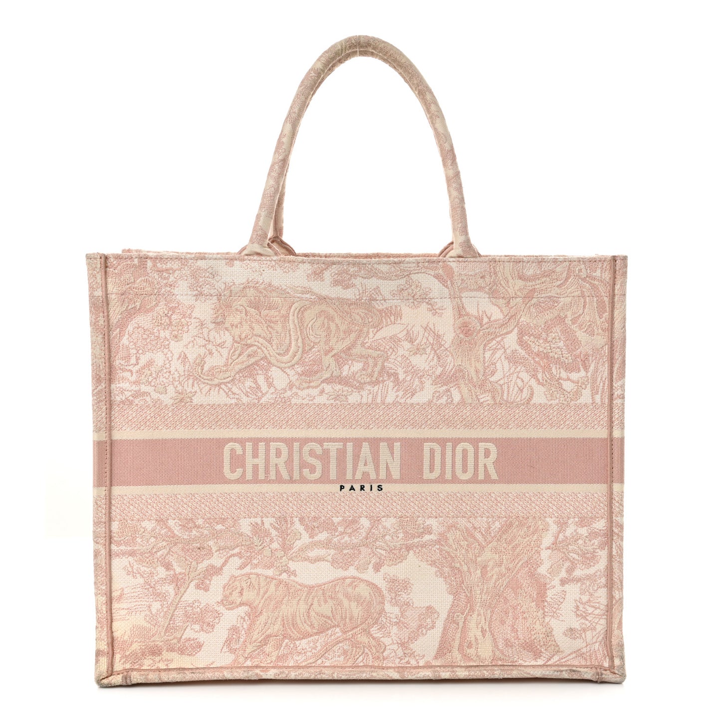 This is an authentic CHRISTIAN DIOR Canvas Toile De Jouy Embroidered Large Book Tote in Pink. This colorful tote is finely crafted of embroidered canvas with a bold jungle graphic in pink. The bag features matching canvas rolled handles, with the CHRISTIAN DIOR logo embroidered across the front. The bag opens to a spacious fabric interior.Follow this item for alerts. Christian Dior is a registered trademark of Christian Dior. FASHIONPHILE is not affiliated with Christian Dior.