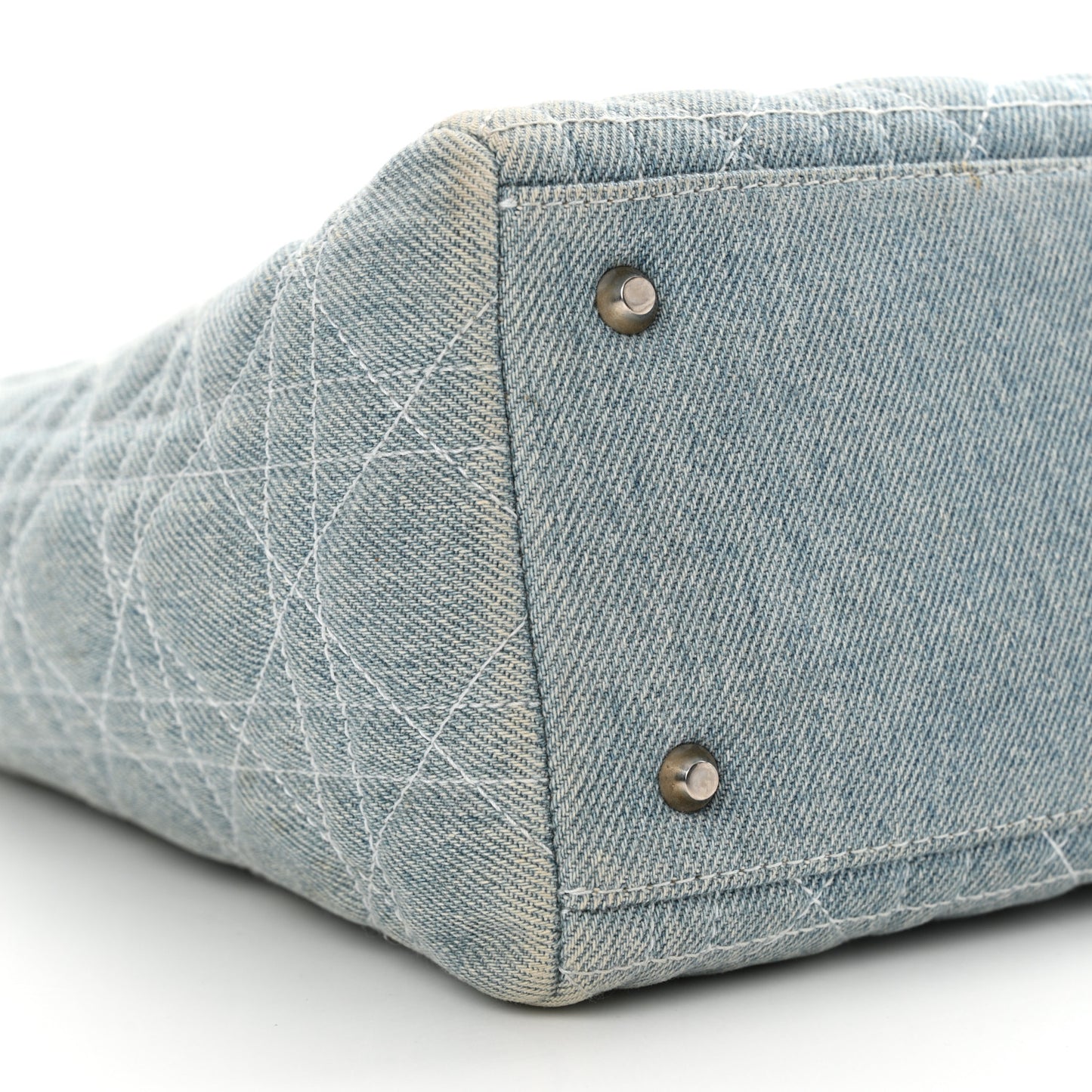 This is an authentic CHRISTIAN DIOR Denim Cannage Medium Lady Dior in Light Blue. This stylish tote is crafted of fine denim in a geometric quilted print. The bag features a Dior charm, transparent plastic top handles and silver hardware. The top zipper opens to a dark blue CD monogram interior.Follow this item for alerts. Christian Dior is a registered trademark of Christian Dior. FASHIONPHILE is not affiliated with Christian Dior.