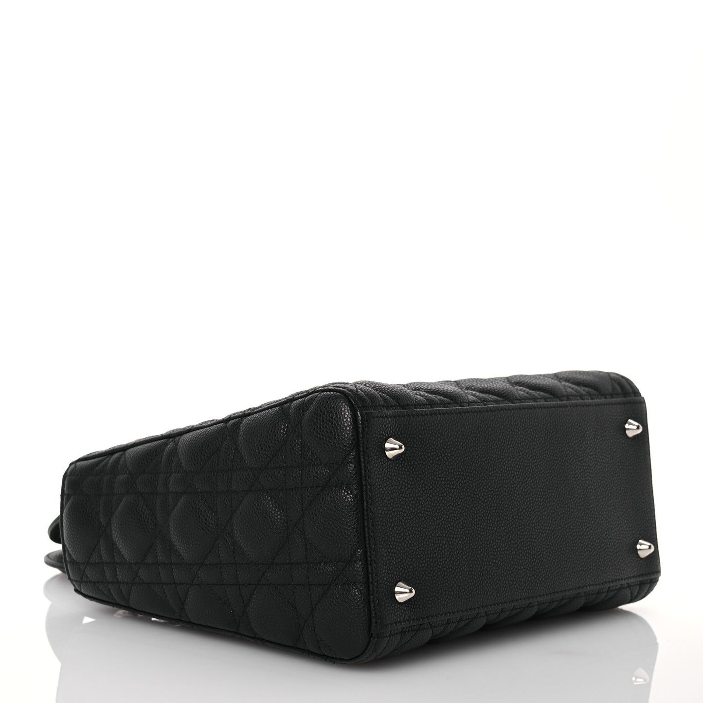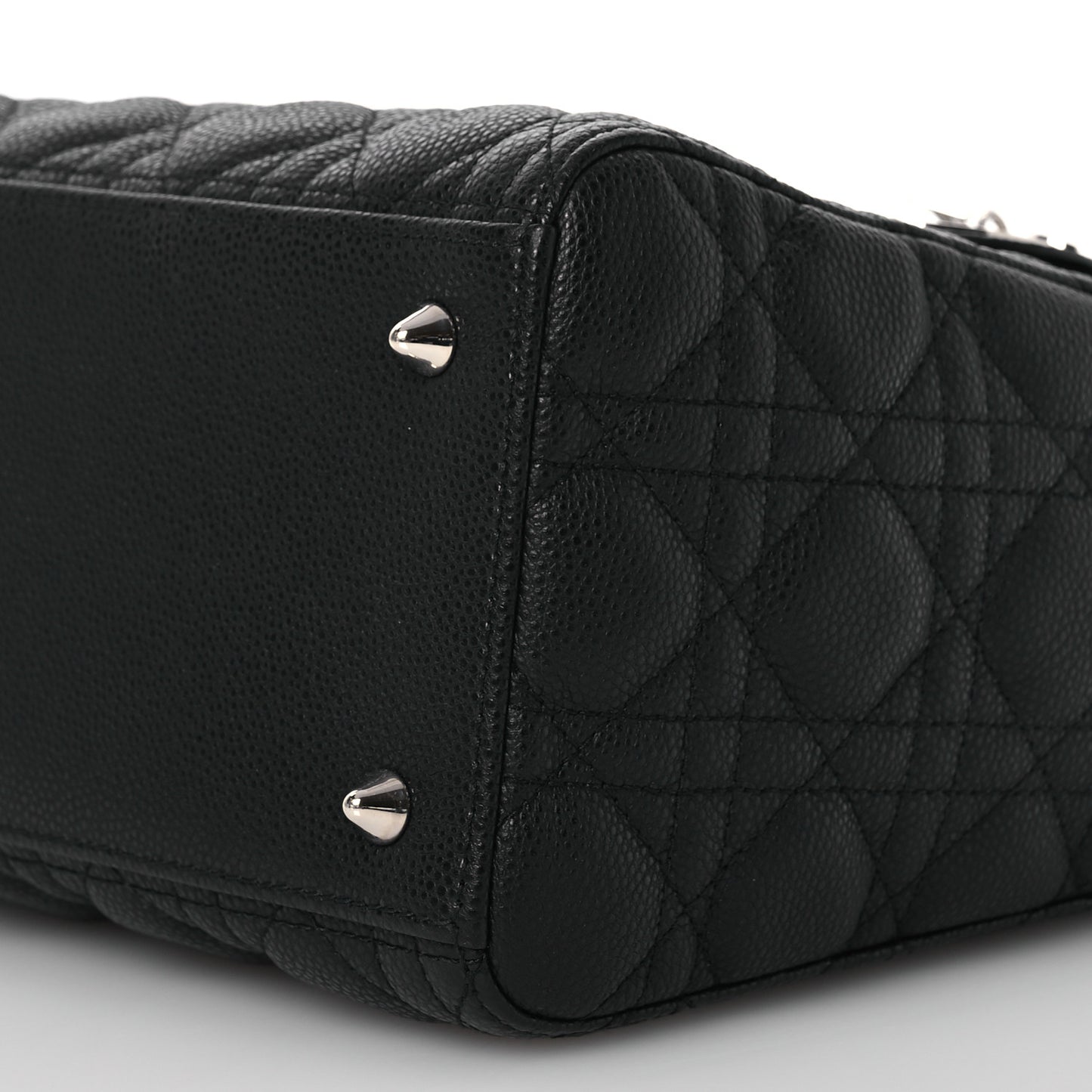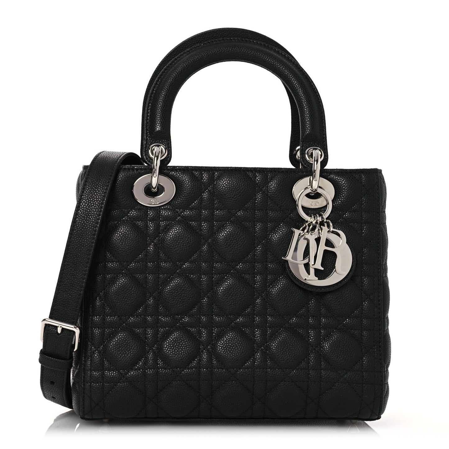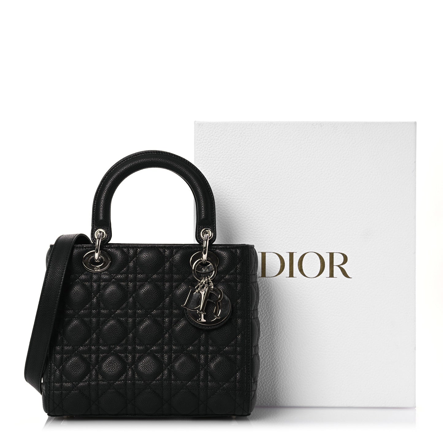 This is an authentic CHRISTIAN DIOR Grained Calfskin Cannage Medium Lady Dior in Black. This chic tote is crafted of black cannage quilted textured calfskin leather. The bag features sturdy leather top handles, and an optional shoulder strap with silver hardware including hanging Dior logo charms. The top flap opens to a black fabric interior with pockets.Follow this item for alerts. Christian Dior is a registered trademark of Christian Dior. FASHIONPHILE is not affiliated with Christian Dior.