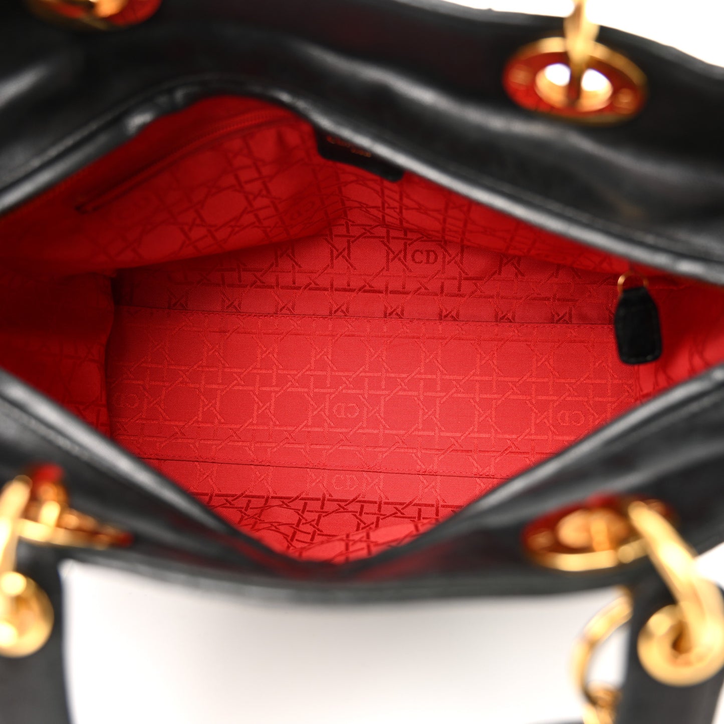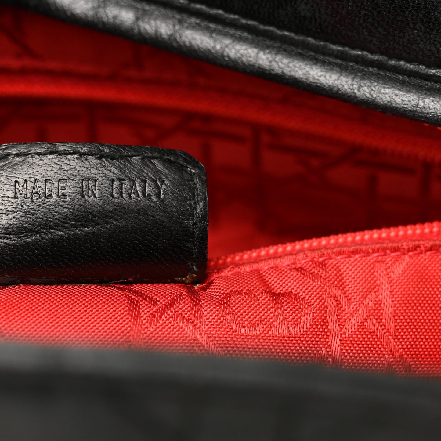 This is an authentic CHRISTIAN DIOR Lambskin Cannage Large Lady Dior in Black. This stylish handbag is crafted of luxurious geometric-quilted lambskin leather in black. The bag features leather top handles and silver hardware including hanging Dior initials logo charms. The top zipper opens to a bright red Dior monogram jacquard fabric interior with a zipper pocket.Follow this item for alerts. Christian Dior is a registered trademark of Christian Dior. FASHIONPHILE is not affiliated with Christian Dior.