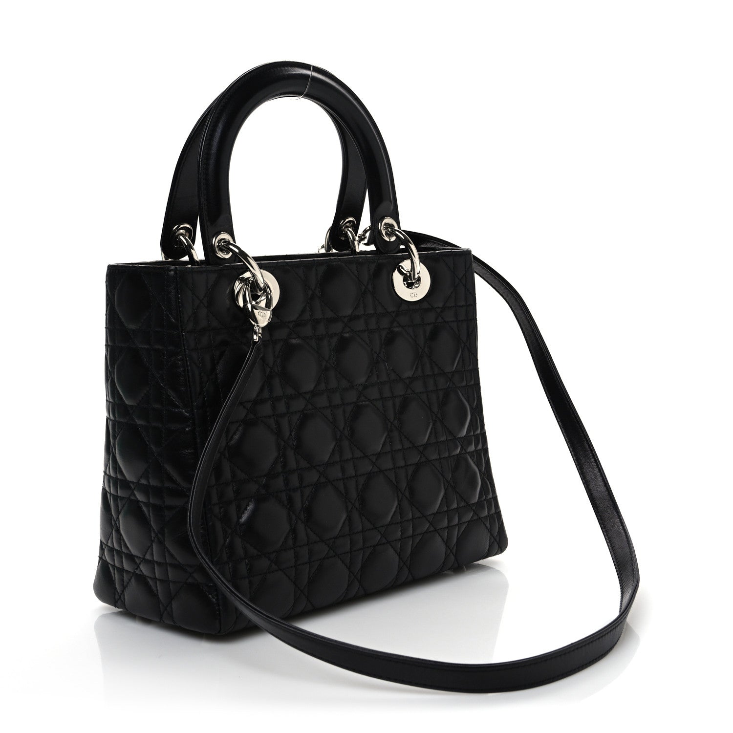 This is an authentic CHRISTIAN DIOR Lambskin Cannage Medium Lady Dior in Black. This chic tote is crafted of black cannage quilted lambskin leather. The shoulder bag features leather top handles and an optional shoulder strap with polished silver hardware, including a hanging Dior logo charm. The top zipper opens to a red Dior monogram jacquard fabric interior with a zipper pocket.Follow this item for alerts. Christian Dior is a registered trademark of Christian Dior. FASHIONPHILE is not affiliated with Christian Dior.