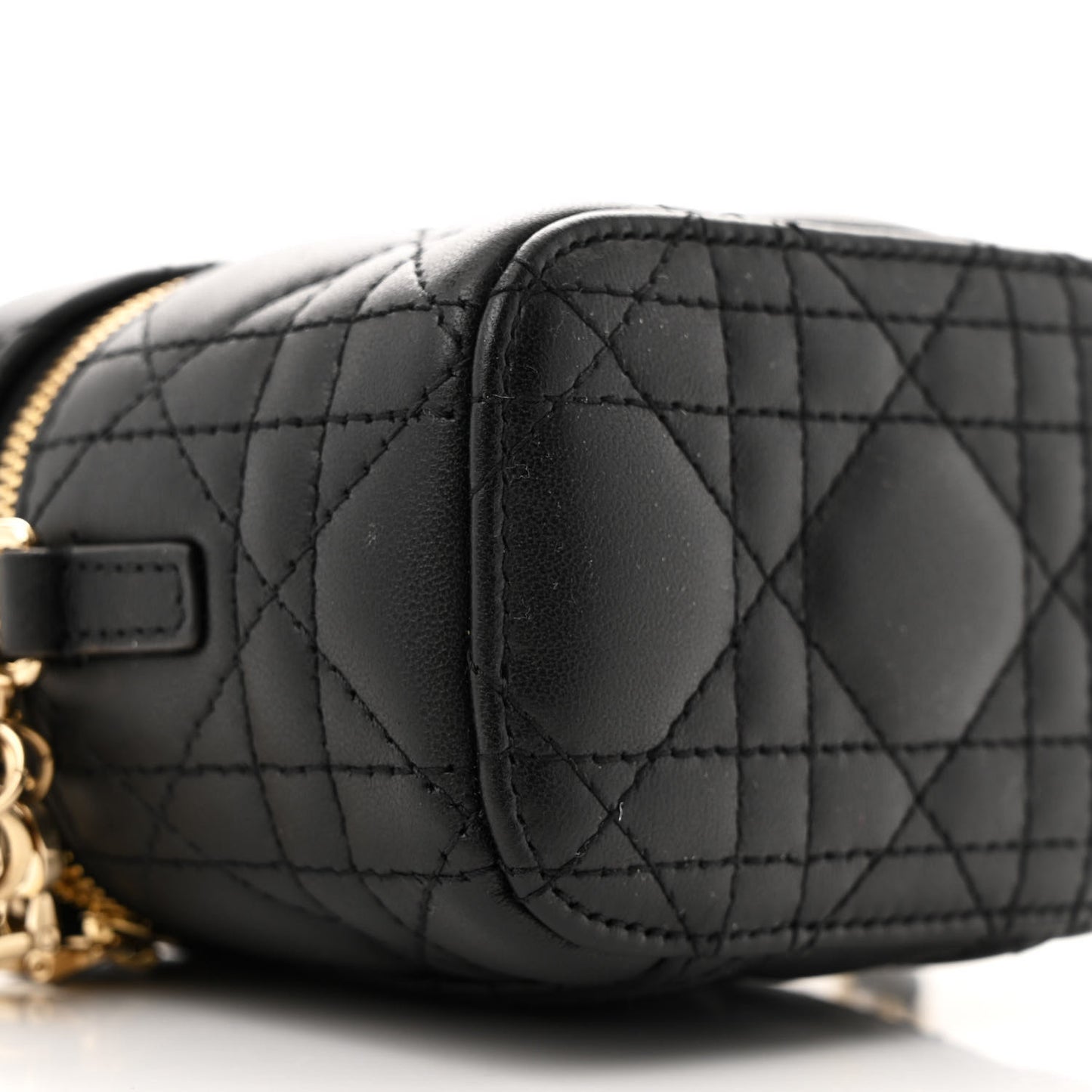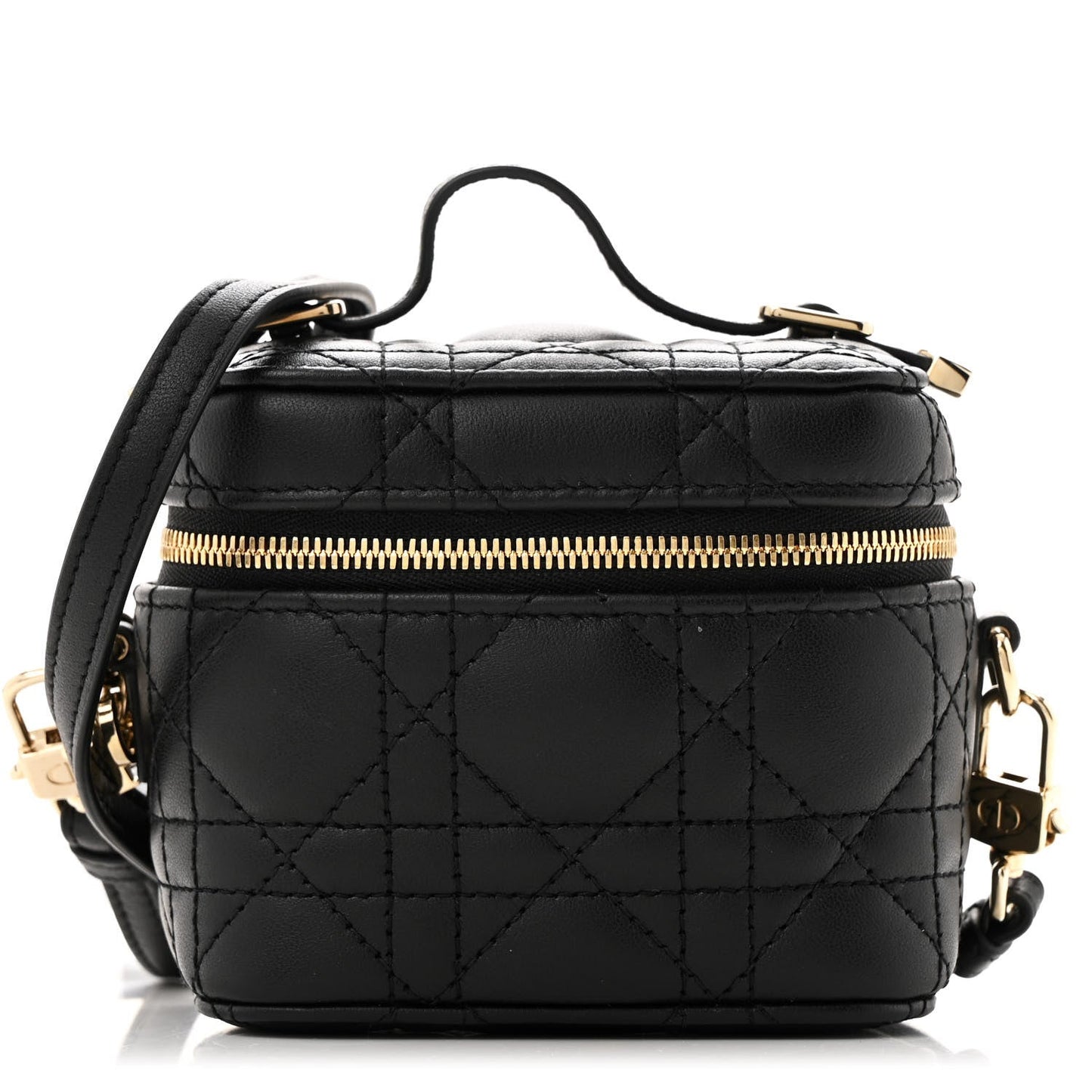 This is an authentic CHRISTIAN DIOR Lambskin Cannage Micro Lady Dior Vanity Case in Black. This stylish beauty case is finely crafted of black lambskin cannage quilted leather. The bag features a top handle, an optional adjustable shoulder strap, and polished gold hardware including a Dior initials charm. The zipper opens to a compact black microfiber interior.Follow this item for alerts. Christian Dior is a registered trademark of Christian Dior. FASHIONPHILE is not affiliated with Christian Dior.