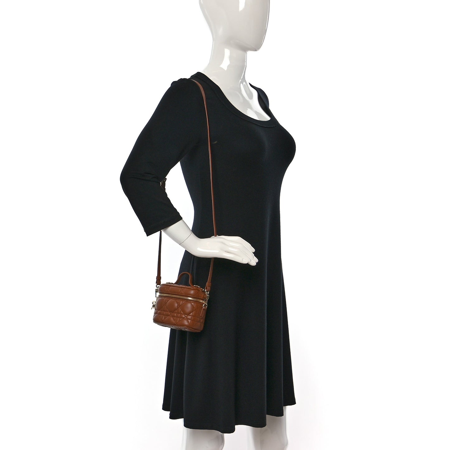 This is an authentic CHRISTIAN DIOR Lambskin Cannage Micro Lady Dior Vanity Case in Cognac. This stylish beauty case is finely crafted of brown lambskin cannage. The bag features a top handle, an optional adjustable shoulder strap, and bold gold hardware. The zipper opens to a matching interior with flat patch pockets.Follow this item for alerts. Christian Dior is a registered trademark of Christian Dior. FASHIONPHILE is not affiliated with Christian Dior.
