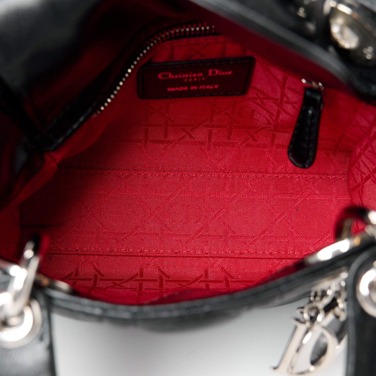 This is an authentic CHRISTIAN DIOR Lambskin Cannage Mini Lady Dior in Black. This delightful mini tote is crafted of lambskin leather with a geometric-quilted design in black. The bag has matching black leather top handles and polished silver hardware, including a hanging Dior charm and a leather strap. The interior is a red Dior logo jacquard with a zipper pocket.Follow this item for alerts. Christian Dior is a registered trademark of Christian Dior. FASHIONPHILE is not affiliated with Christian Dior.