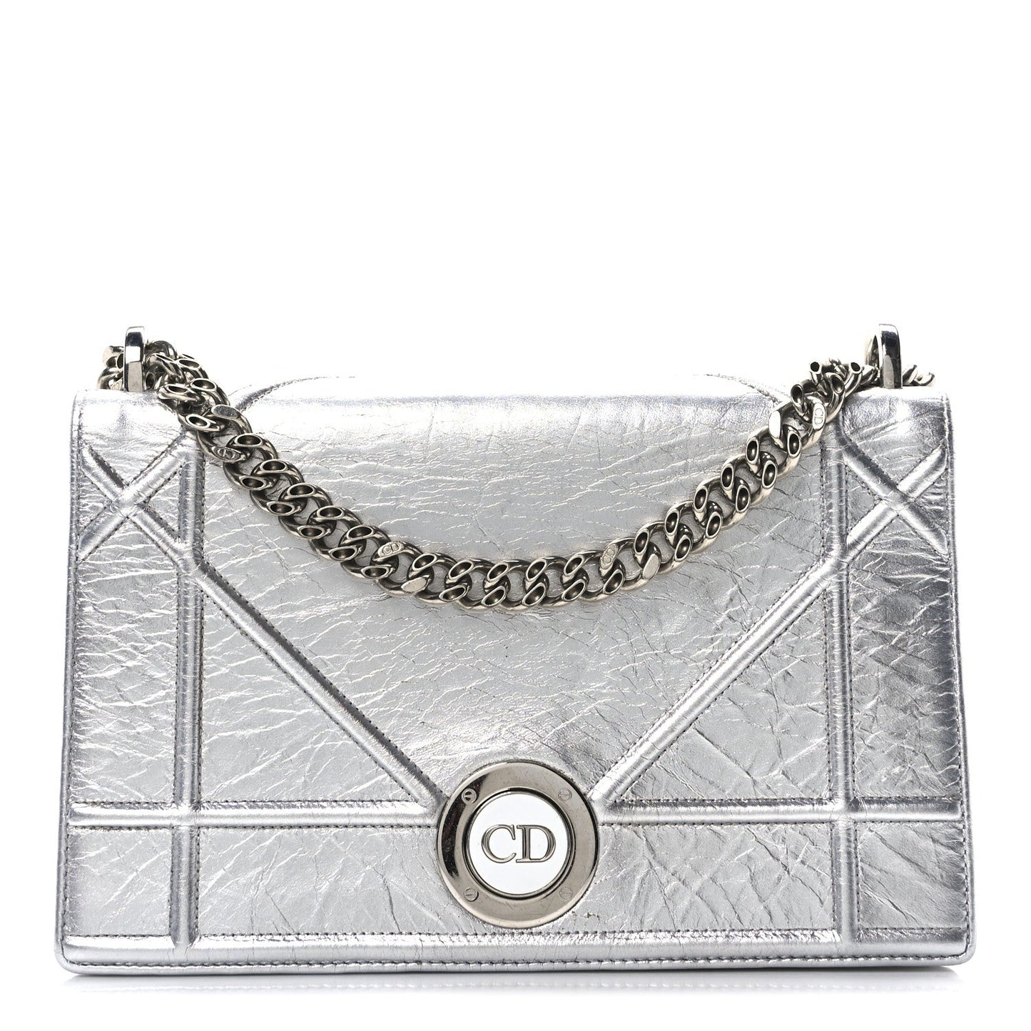 Christian Dior/ Bags/ Shoulder Bags /Christian Dior Metallic Crinkled Lambskin Medium Diorama Flap Bag Silver