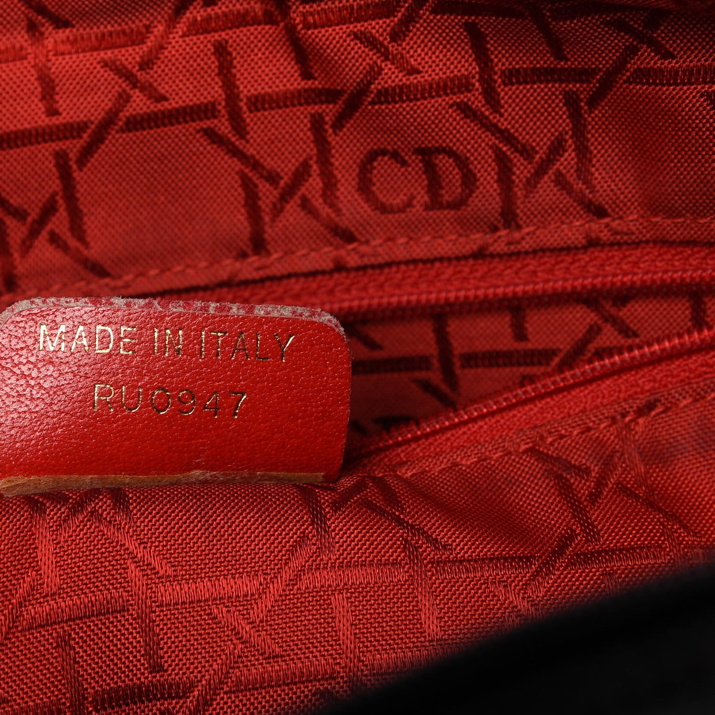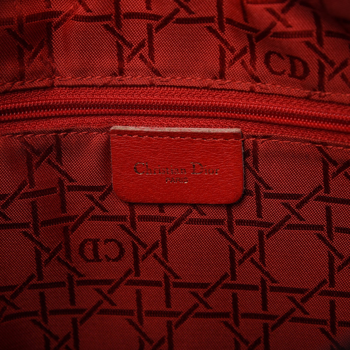 This is an authentic CHRISTIAN DIOR Nylon Cannage Large Lady Dior Tote in Black. This stylish handbag is crafted of geometric quilted nylon in black. The classic bag features sturdy, reinforced top handles with polished gold hoop links and a gold Dior hanging logo charm. The top zipper opens to a red Dior monogram jacquard interior with a zipper pocket.Follow this item for alerts. Christian Dior is a registered trademark of Christian Dior. FASHIONPHILE is not affiliated with Christian Dior.