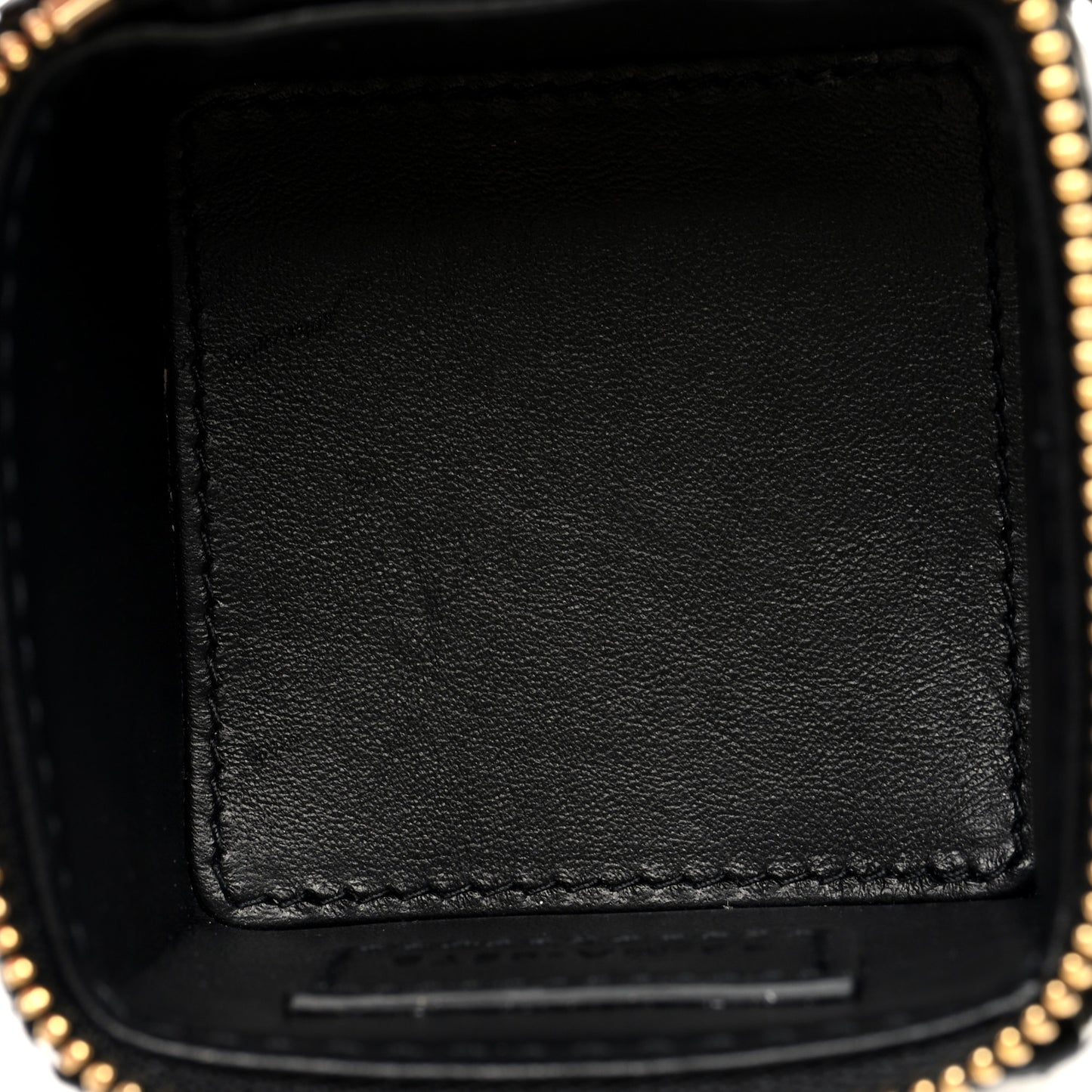 This is an authentic CHRISTIAN DIOR Patent Cannage Micro Lady Dior Vanity Case in Black. This stylish cube shaped case is finely crafted of patent cannage in black. It features a wristlet chain strap with white resin pearl embellishments, and gold hardware. The top zipper opens to a compact leather interior.Follow this item for alerts. Christian Dior is a registered trademark of Christian Dior. FASHIONPHILE is not affiliated with Christian Dior.