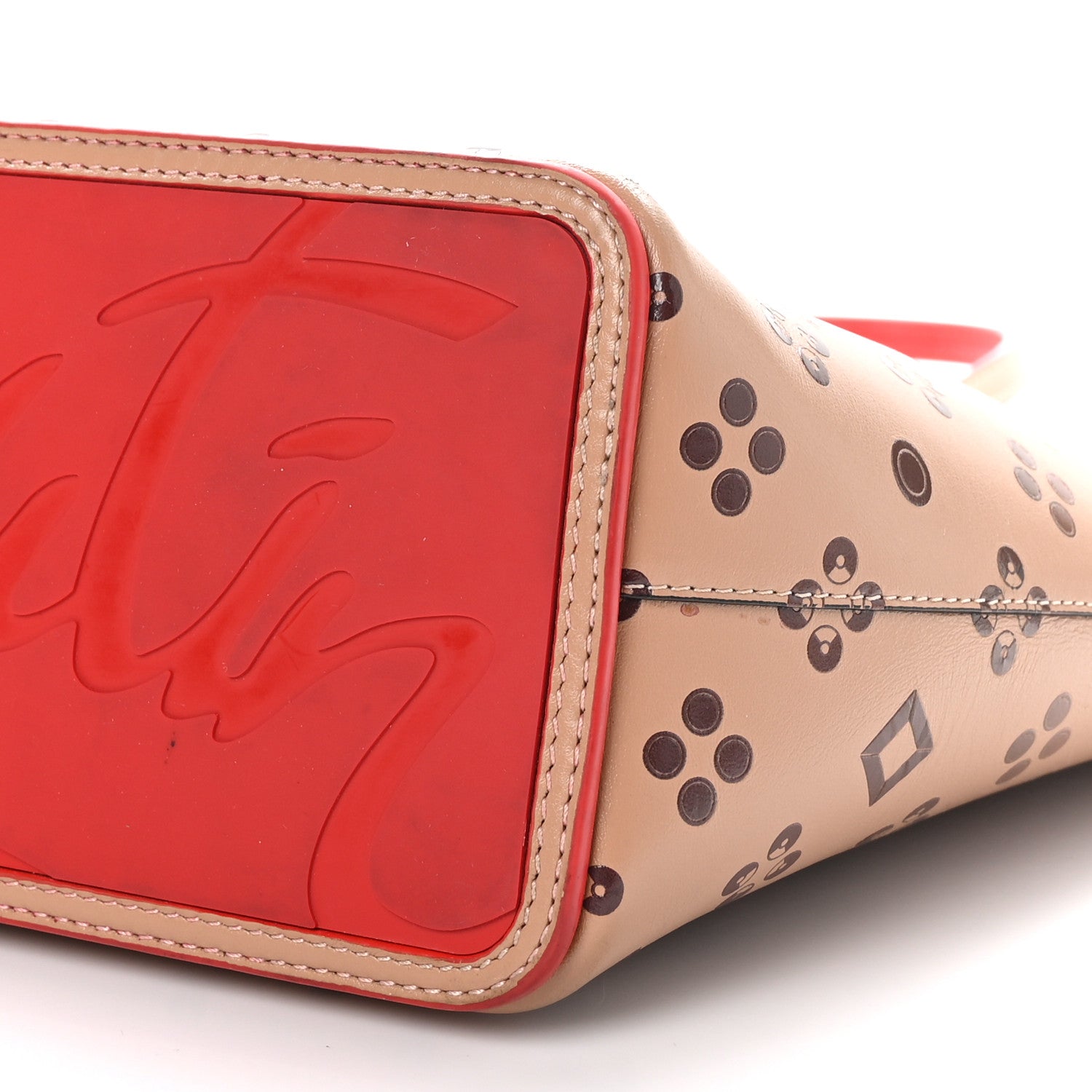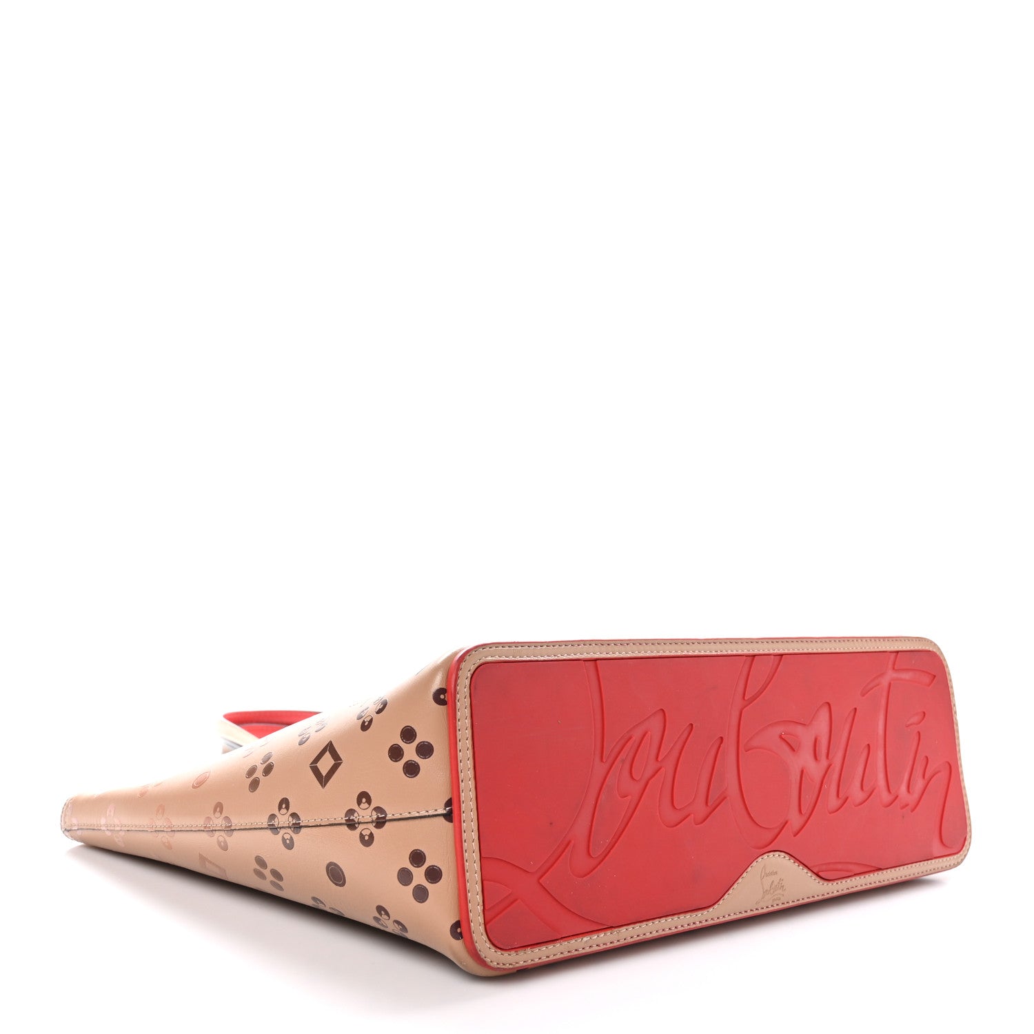 This is an authentic CHRISTIAN LOUBOUTIN Calfskin Patent Degrade Loubinthesky East West Cabata Tote in Nude. This chic tote is crafted of smooth leather with gradient brown printed logos. It features leather strap handles with silver studs accents and an embossed logo script across the base. The top is open to a red leather interior with a matching removable pouch.Follow this item for alerts. Christian Louboutin is a registered trademark of Christian Louboutin. FASHIONPHILE is not affiliated with Christian Louboutin.