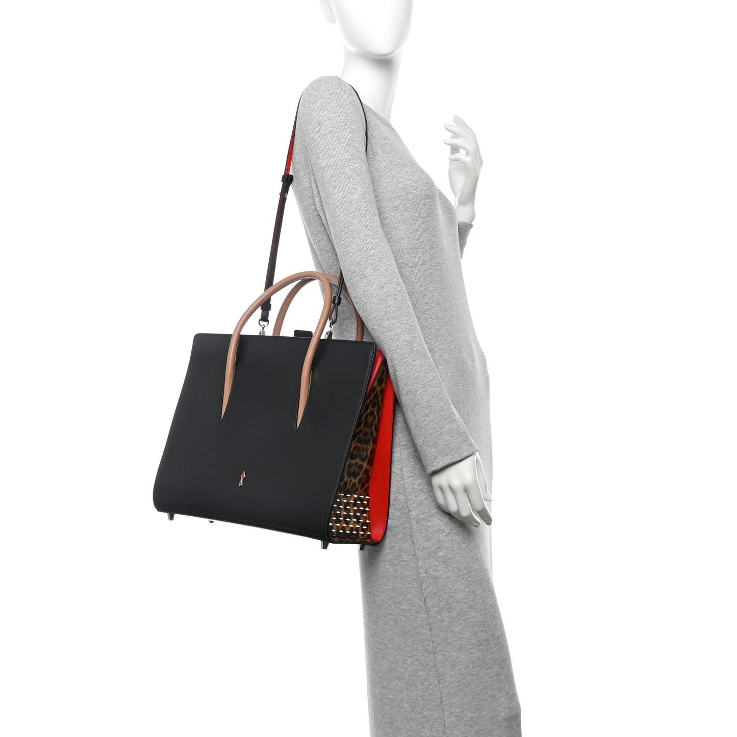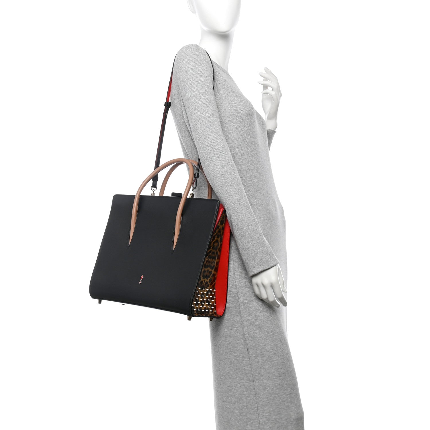 This is an authentic CHRISTIAN LOUBOUTIN Calfskin Patent Leopard Spiked Large Paloma in Black. This stylish tote is crafted of smooth black calfskin leather. The bag features gusseted red leather sides framing a central leopard print patent leather panel, embellished with polished light gold cone studs, beige rolled handles, and an optional shoulder strap. The top is open to a red suede interior with central zipper compartment and a patch pocket.Follow this item for alerts. Christian Louboutin is a registered trademark of Christian Louboutin. FASHIONPHILE is not affiliated with Christian Louboutin.