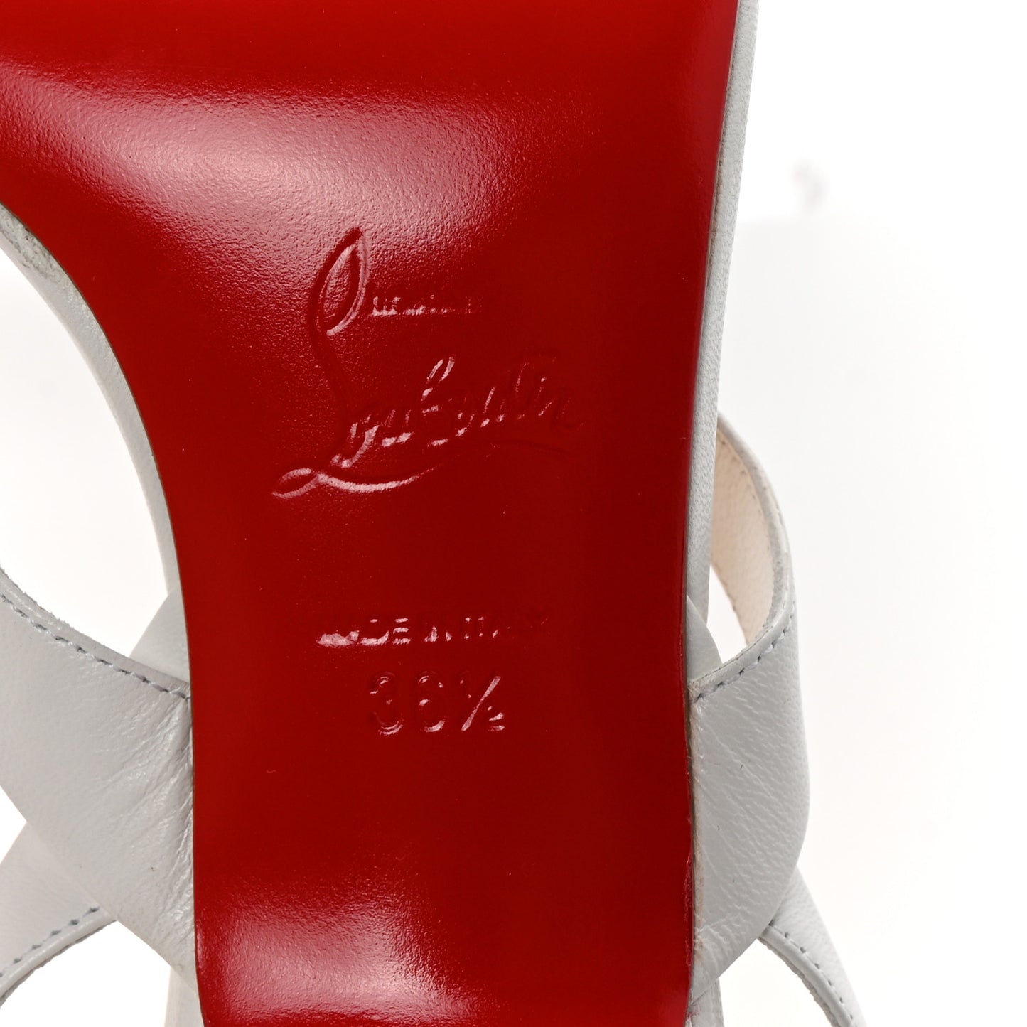This is an authentic pair of CHRISTIAN LOUBOUTIN Calfskin Taralita 55 Sandal Size 36.5 in White. These stylish heels are crafted of white calfskin leather and feature a 2.5-inch matching leather stiletto heel and an open toe. The adjustable thin ankle strap crosses over along the front of the heel intersecting with a second ankle strap.Follow this item for alerts. Christian Louboutin is a registered trademark of Christian Louboutin. FASHIONPHILE is not affiliated with Christian Louboutin.