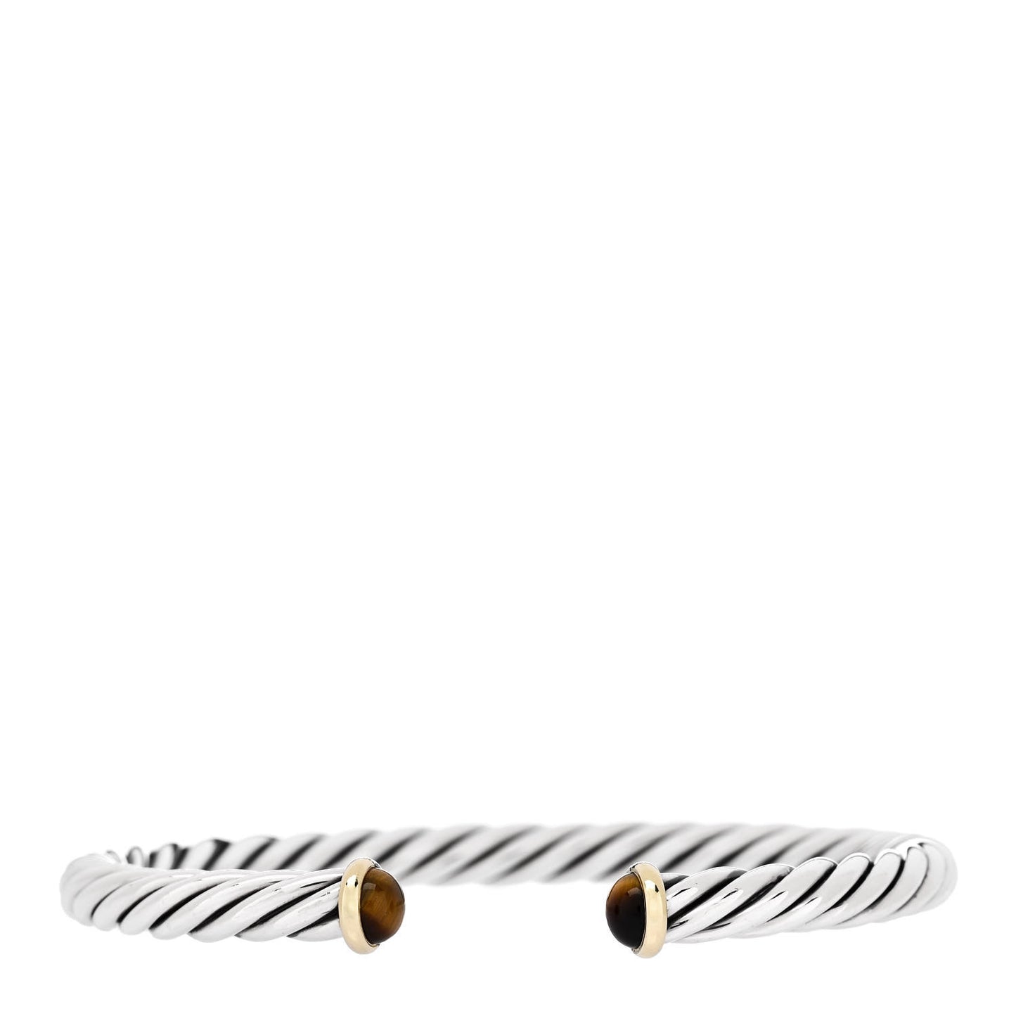This is an authentic DAVID YURMAN Sterling Silver 14K Yellow Gold Tiger's Eye 6mm Cable Cuff Bracelet. The cuff bracelet is crafted of twisted cable-style sterling silver with 14 karat yellow gold accents and tigers eye at each tip.Follow this item for alerts. David Yurman is a registered trademark of David Yurman. FASHIONPHILE is not affiliated with David Yurman.