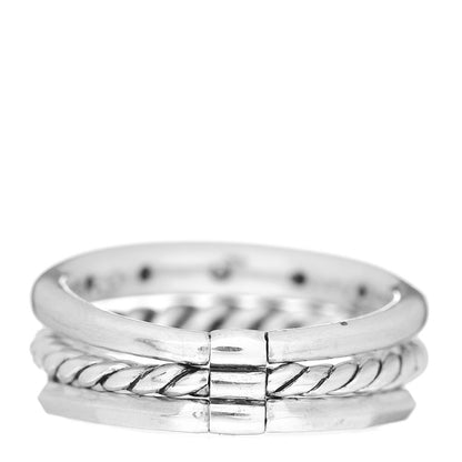 This is an authentic DAVID YURMAN Sterling Silver Diamond 9mm Stax Narrow Ring size 51 or 5.75. The ring is crafted of sterling silver and features three bands in a variety of styles set with sparkling diamonds weighing approximately .10 total carat weight.Follow this item for alerts. David Yurman is a registered trademark of David Yurman. FASHIONPHILE is not affiliated with David Yurman.