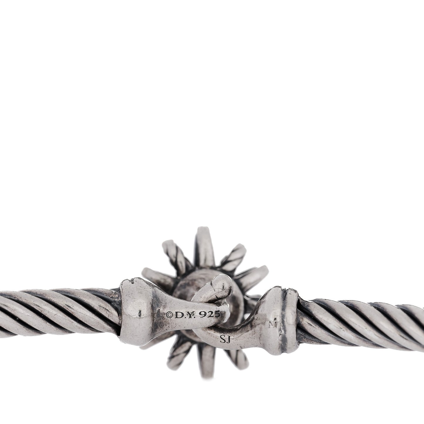 This is an authentic DAVID YURMAN Sterling Silver Diamond Starburst Bracelet. The bracelet is crafted of sterling silver and features a cable bangle with a hook closure featuring a diamond accented starburst motif, approximately .04 total carat weight.Follow this item for alerts. David Yurman is a registered trademark of David Yurman. FASHIONPHILE is not affiliated with David Yurman.