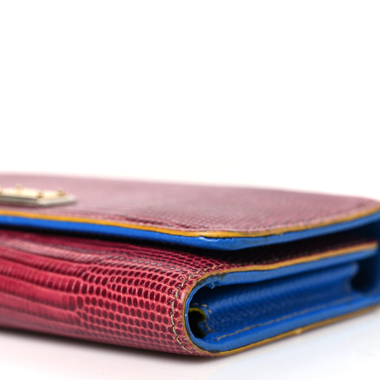 This is an authentic DOLCE & GABBANA Dauphine Stampa Iguana Mini Miss Sicily Chain Phone Case Wallet in Red and Multicolor. This chic crossbody is crafted of iguana embossed grained leather in red. The bag features a dark pink leather handle with gold links, leather anchors and an optional gold chain link shoulder strap. The flap opens to a blue leather interior with a patch pocket and card slots.Follow this item for alerts. Dolce & Gabbana is a registered trademark of Dolce & Gabbana. FASHIONPHILE is not affiliated with Dolce & Gabbana.