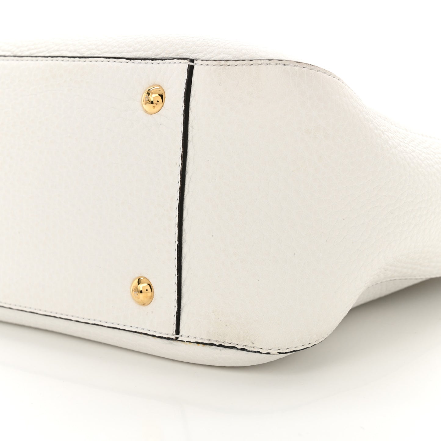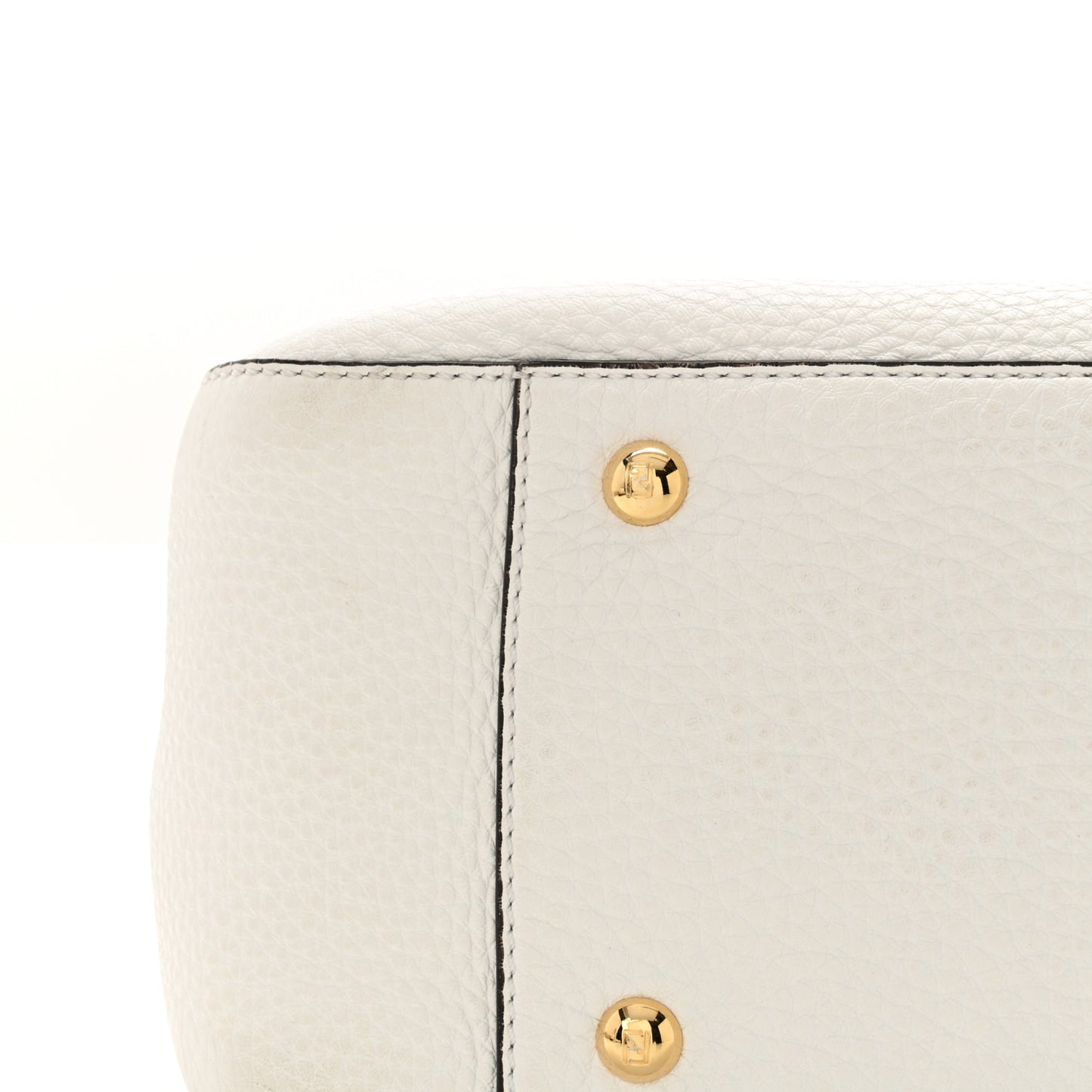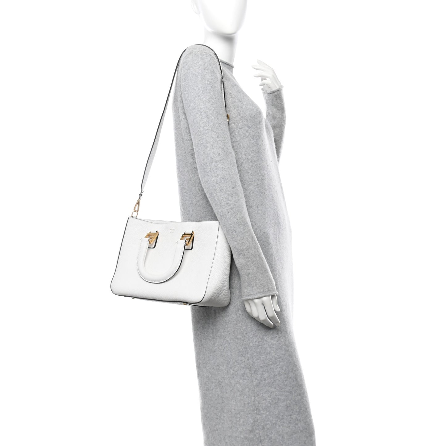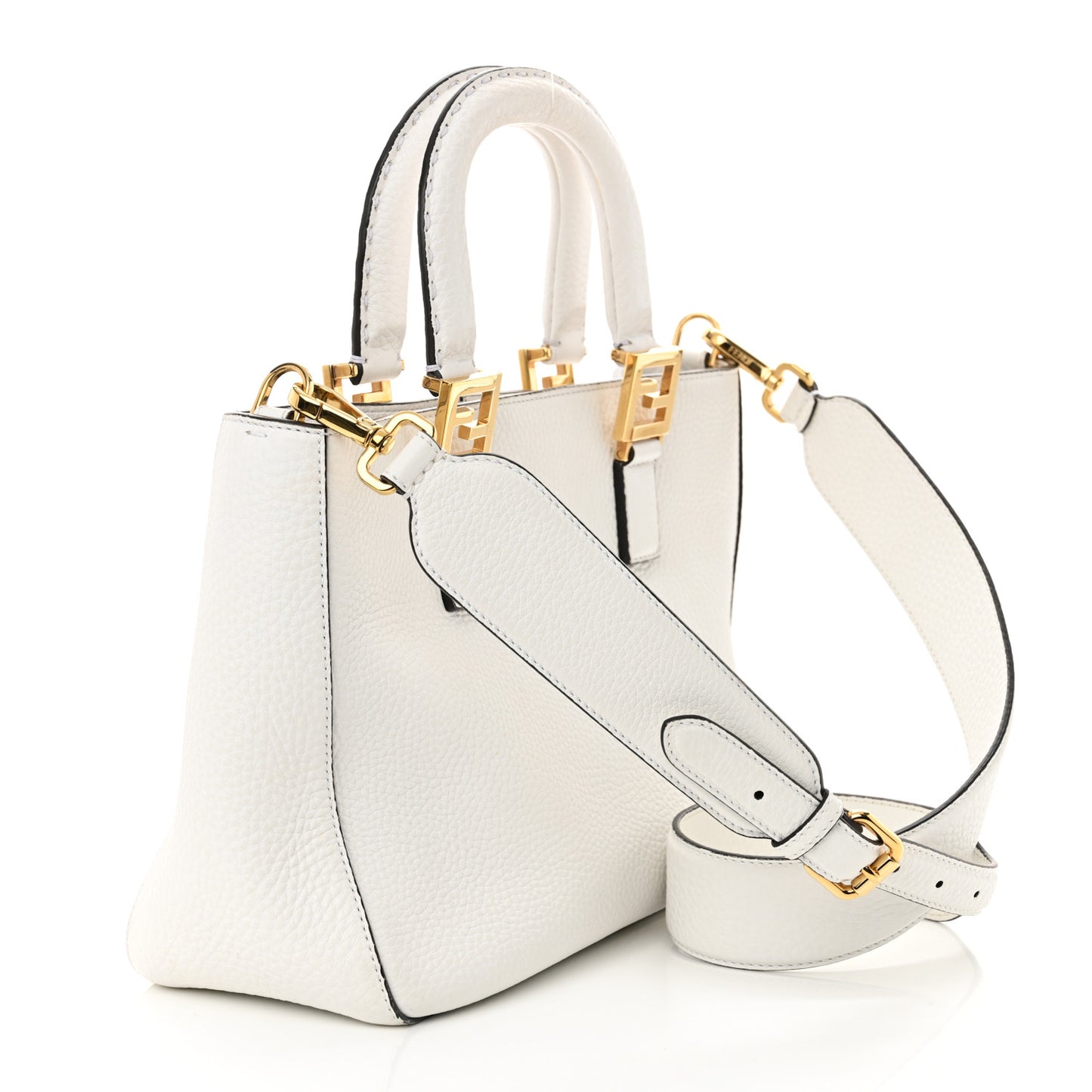 This is an authentic FENDI Vitello Glacier Small FF Tote in White Ice. This stylish tote is crafted of richly smooth calfskin leather in white. The bag features rolled leather top handles with signature gold Fendi FF logo links, including an optional shoulder strap. The top magnet opens to a suede interior with zipper and patch pockets.Follow this item for alerts. Fendi is a registered trademark of Fendi. FASHIONPHILE is not affiliated with Fendi.